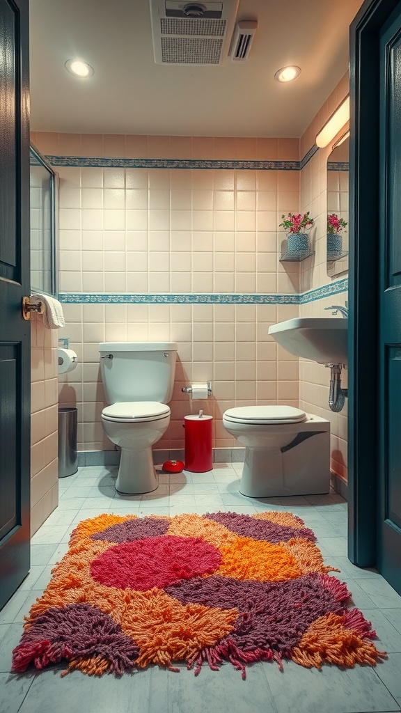 The rug adds warmth and a pop of color against the neutral tiles, creating a fun contrast. It’s not just a floor covering; it’s a statement piece that reflects the carefree spirit of the decade. The plush texture invites bare feet, enhancing the overall comfort of the bathroom.