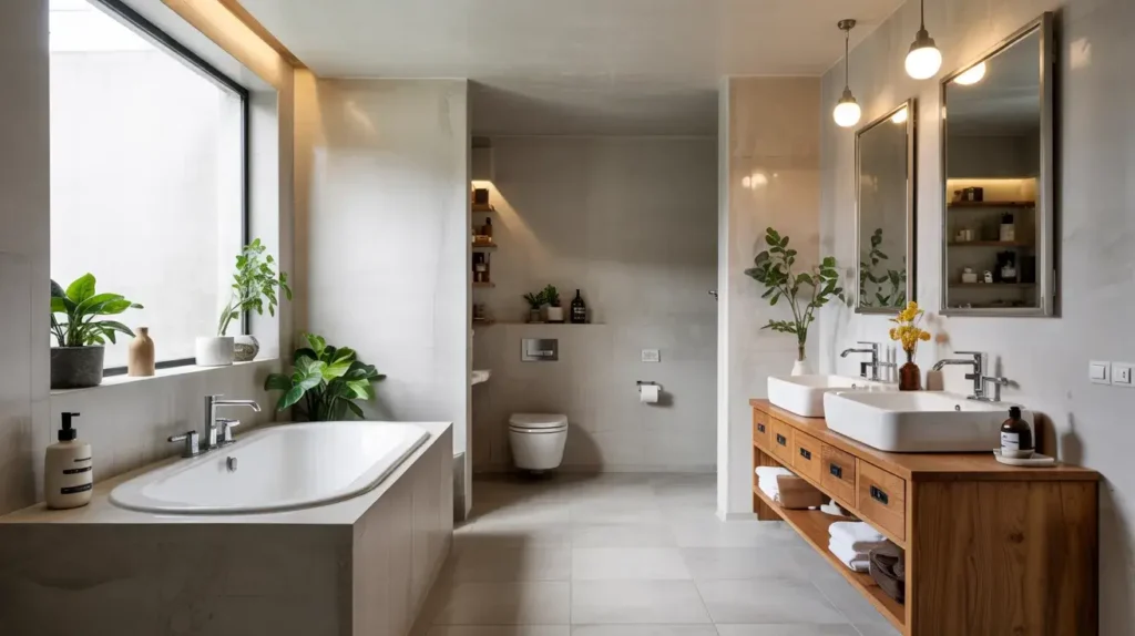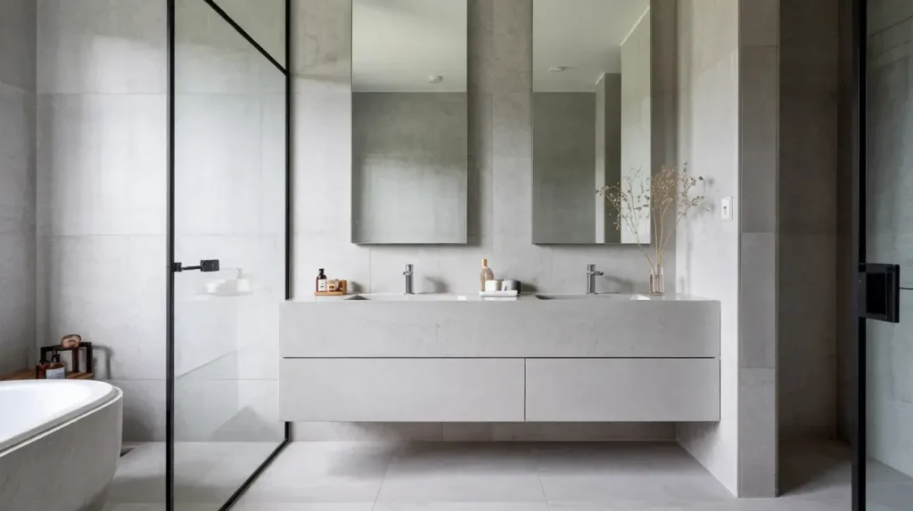 Cool neutrals (cool grays, concrete tones, soft whites) feel crisp and clean. They’re perfect for modern or minimalist bathrooms where you want that fresh, uncluttered vibe.
