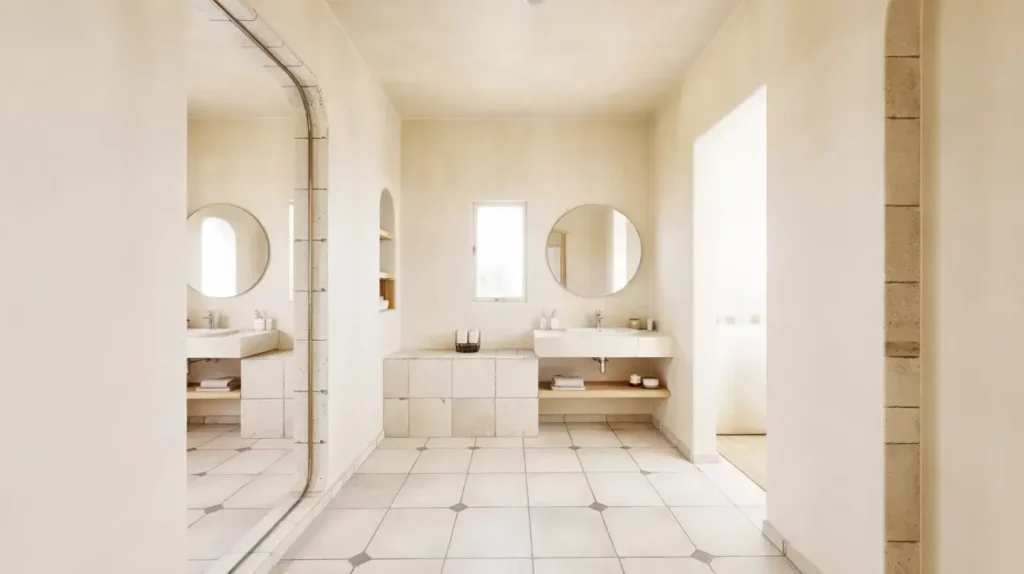 Light-colored tiles work magic in small spaces. I’m talking about soft whites, creams, or pale grays that reflect light and trick your eye into thinking the room is bigger than it actually is. It’s basically optical illusion 101, and it works.