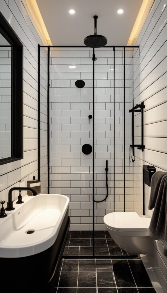 This iconic look combines traditional white subway tiles with bold black grout to create high contrast and vintage charm. It adds definition to each tile and works beautifully in both modern and industrial spaces. It’s also great for low-maintenance bathrooms.