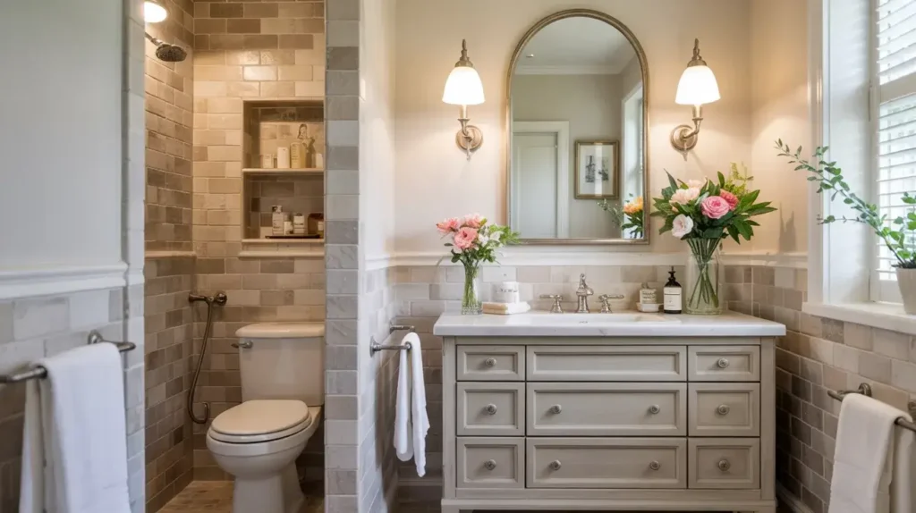 Another modern trick involves using metallic or glass tile accents. A strip of bronze-toned glass tile running horizontally across your shower wall? Chef’s kiss. It adds that upscale, modern touch without requiring you to tile your entire bathroom in expensive materials.