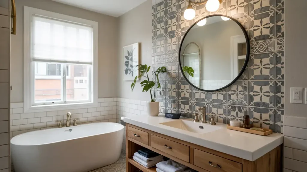 Bold patterned tiles are your jam. Moroccan-inspired designs, geometric prints, colorful encaustic patterns—the options are wild. I installed bright blue and white patterned tiles in my powder room, and every single guest comments on them. It’s like jewelry for your bathroom.