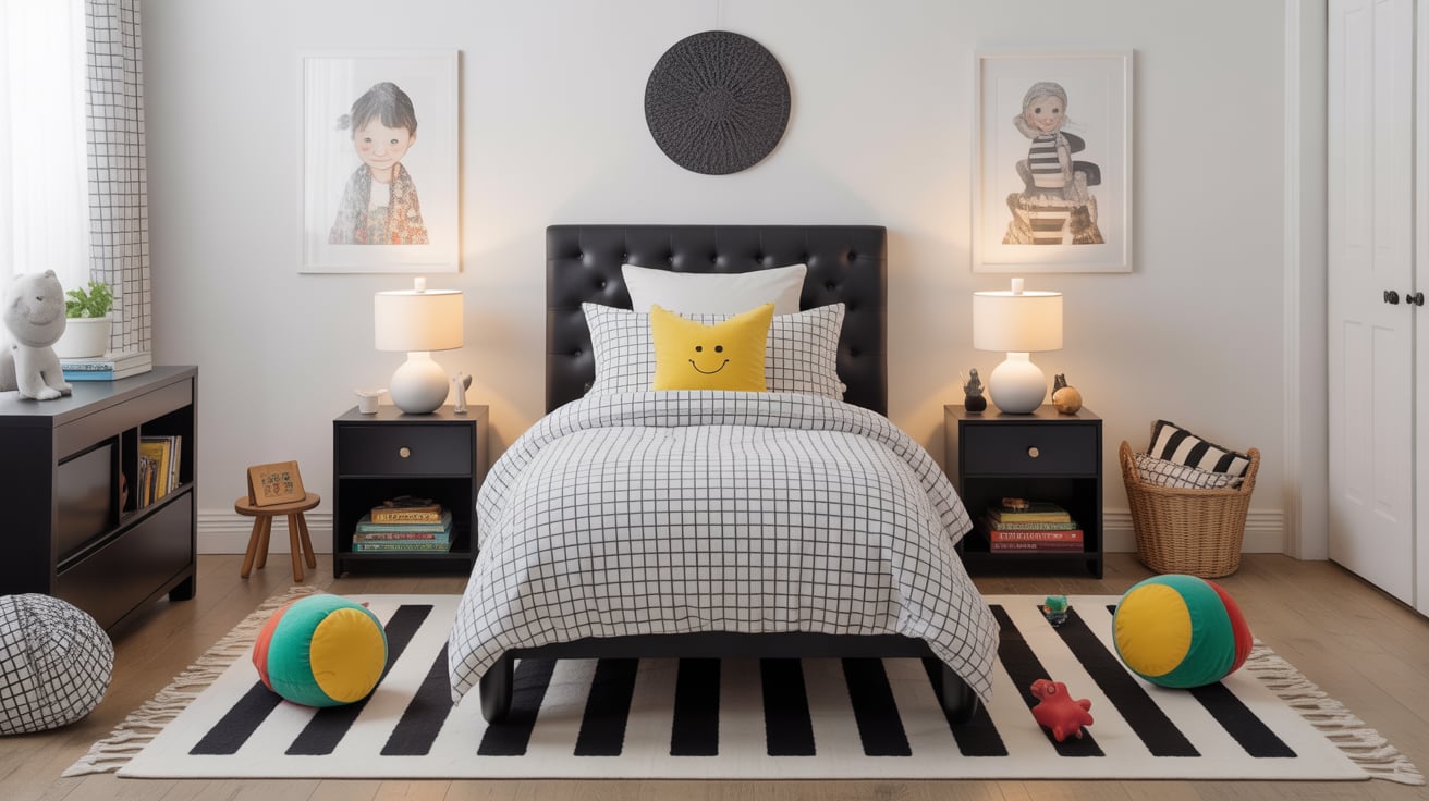 Black-and-white bedrooms aren’t just for adults. Use playful patterns, soft rugs, and fun décor to make it kid-friendly. Add pops of color through toys, cushions, or artwork while keeping the main palette monochrome.