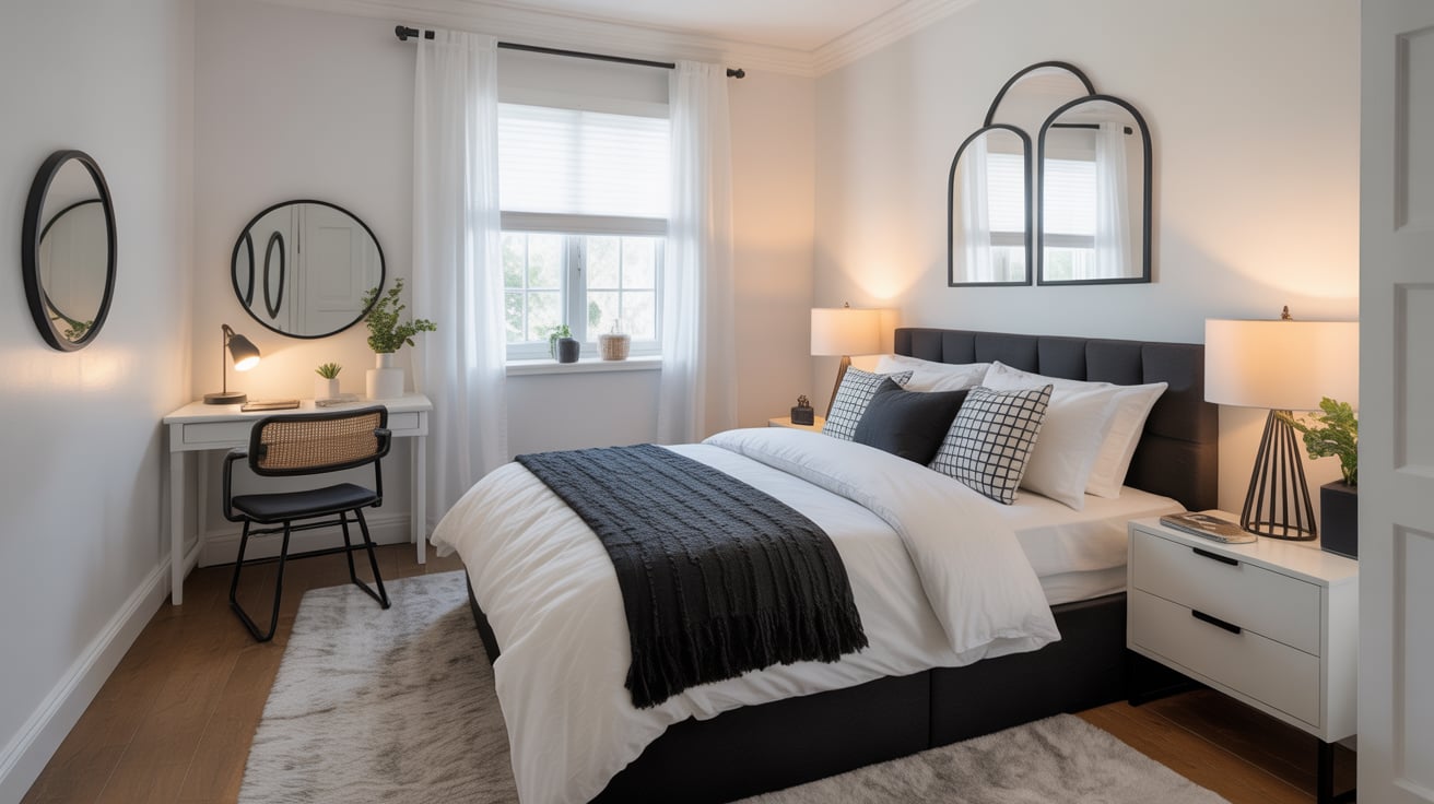 Keep décor minimal and choose multifunctional furniture, like a bed with storage drawers. Even small details like black-and-white artwork or patterned cushions can make a small space stylish without overcrowding it.