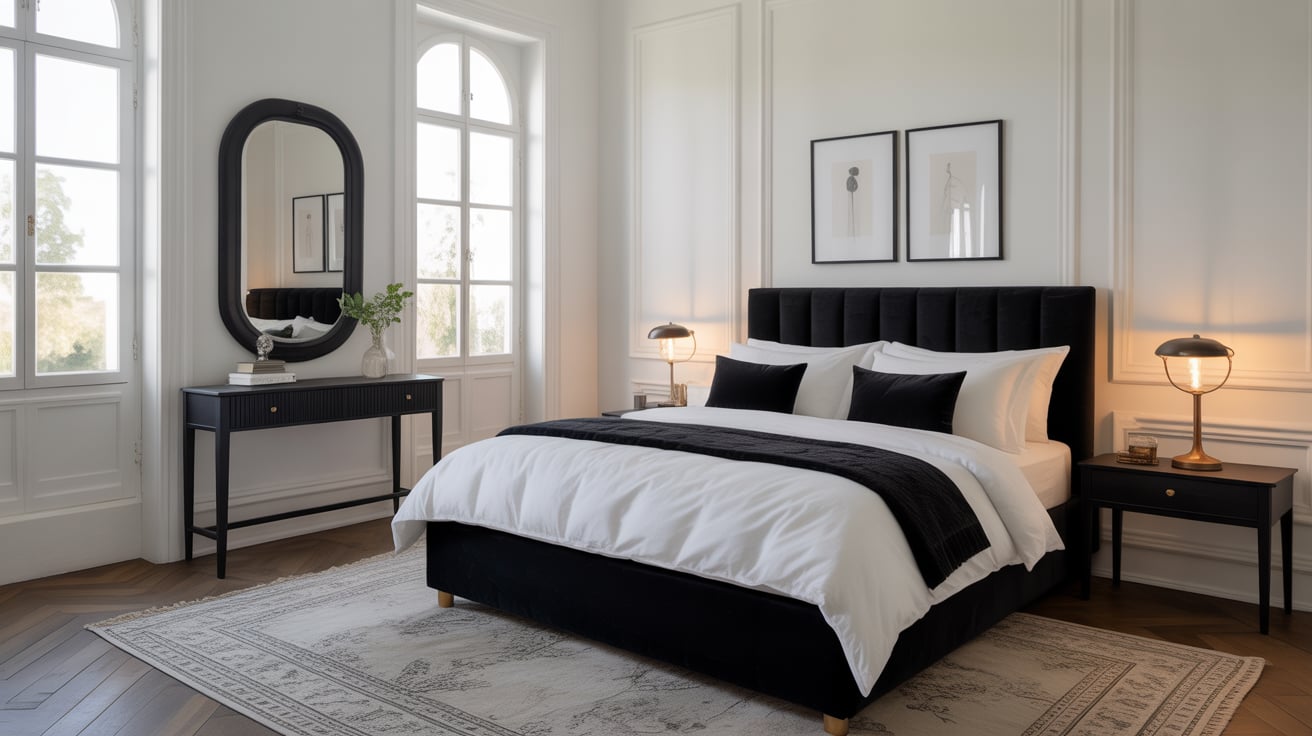 A timeless black-and-white bedroom never goes out of style. Start with crisp white walls as your base and add black furniture or décor accents. This contrast creates a clean, sophisticated look that feels both modern and elegant.
