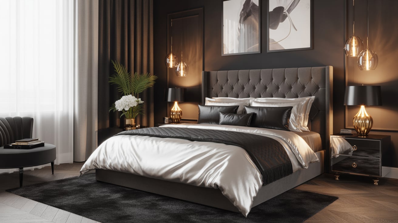 Create a luxurious feel with a black-and-white bedroom by choosing high-quality fabrics and sleek furniture. Think velvet cushions, satin bedding, or a tufted black headboard paired with crisp white sheets.