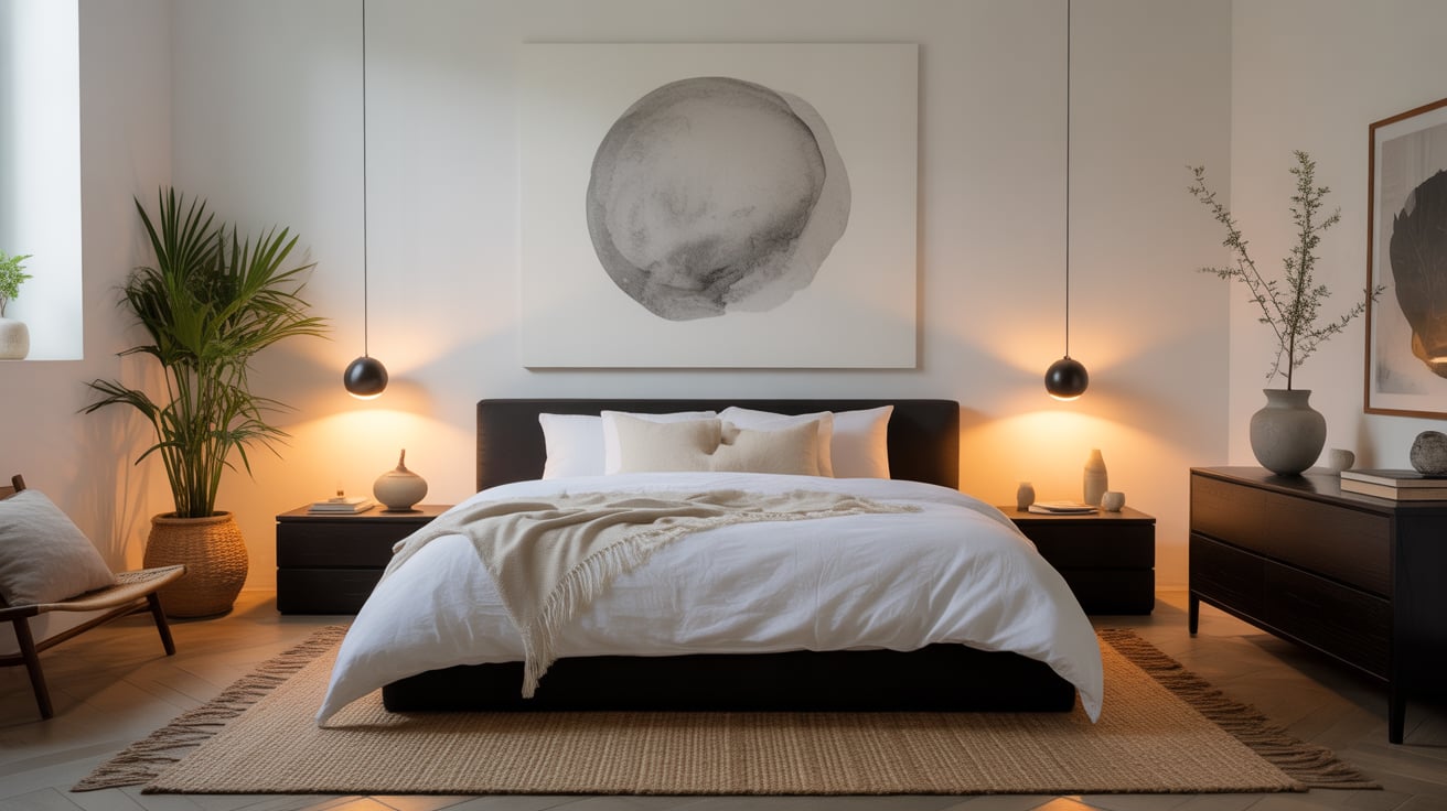 This approach balances monochrome elegance with natural calm, creating a peaceful, refreshing bedroom perfect for relaxation and rejuvenation.