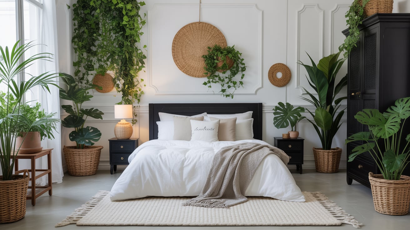 Bring nature into a black-and-white bedroom with plants and natural textures. Greenery pops beautifully against black-and-white walls and furniture. Wooden furniture or wicker baskets add warmth and earthiness.