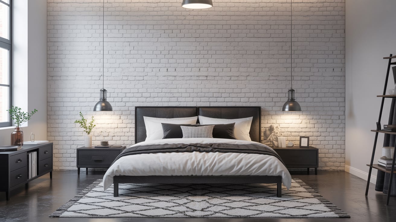 For a modern, edgy feel, try an industrial black-and-white bedroom. Use black metal furniture, exposed light fixtures, and concrete or brick accents. White walls keep the room bright and balance the darker elements.