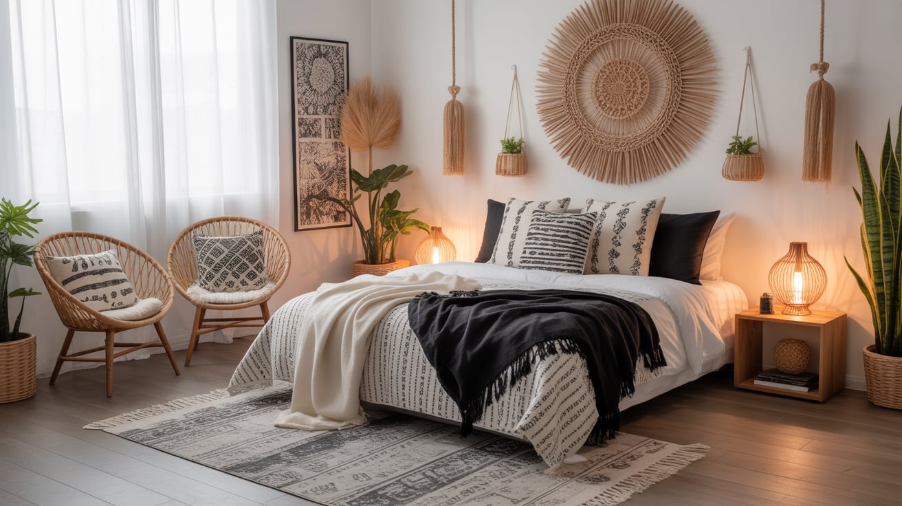 Mixing black-and-white with bohemian style creates a unique, relaxed vibe. Use black-and-white patterned textiles, like cushions or rugs, and combine them with natural elements like rattan furniture and woven wall hangings.