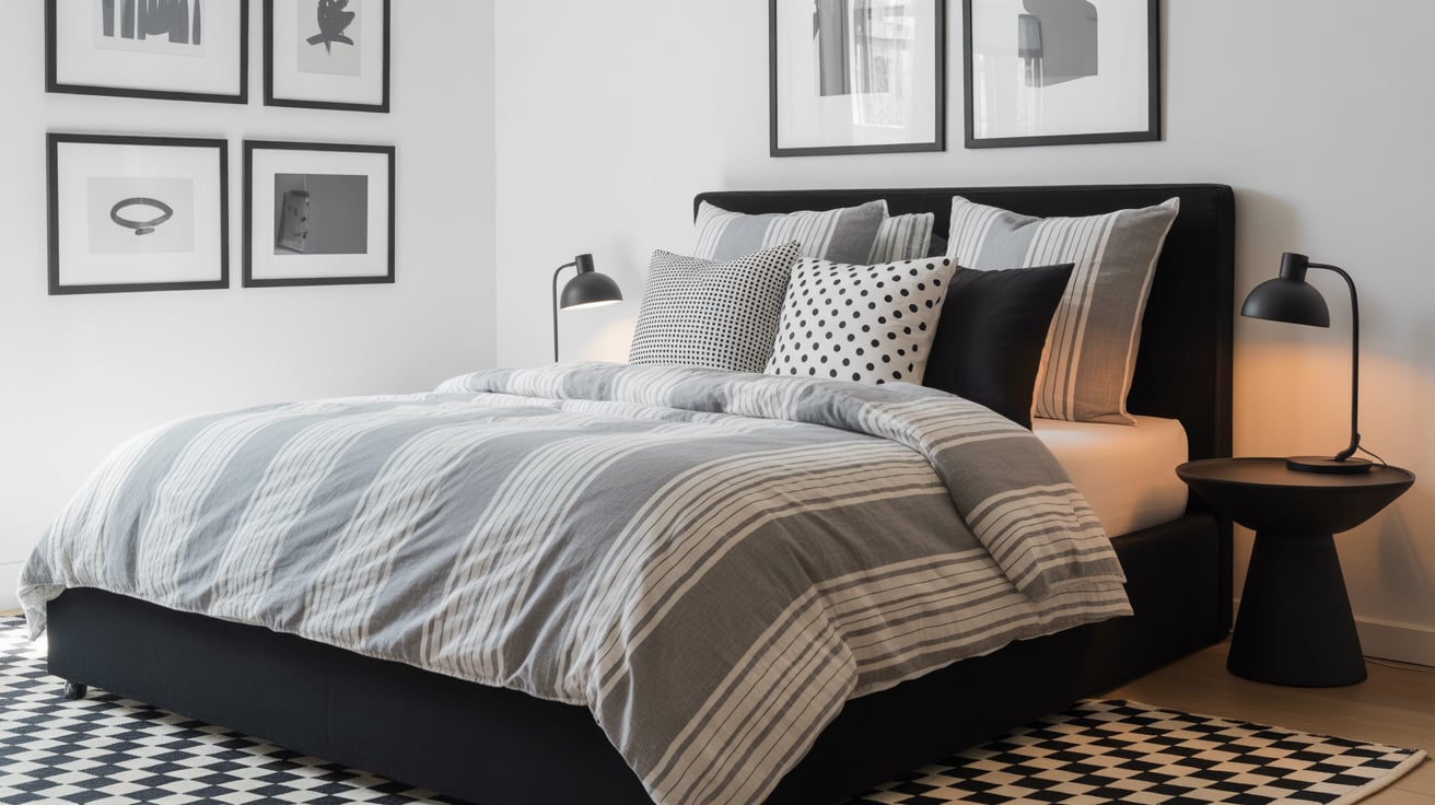 Balance bold patterns with solid-colored elements to avoid overwhelming the room. Layering textures and prints strategically gives your bedroom a fun, artistic vibe without losing its chic black-and-white style.