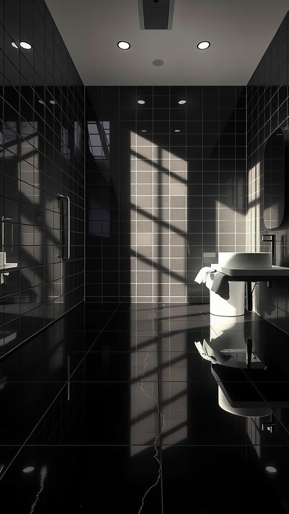 A black bathroom floor can create a striking impact. The glossy finishes reflect light beautifully, making the space feel larger and more open. This effect is especially notable in the image. The shiny tiles catch the light, adding a sense of depth and dimension to the room.