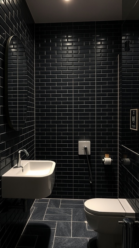 A black bathroom can be both stylish and eco-friendly. The image showcases a chic design that highlights sustainable choices. The black brick wall gives a modern vibe while being easy to clean and maintain. Using materials like reclaimed wood or recycled tiles can also enhance the look without harming the planet.