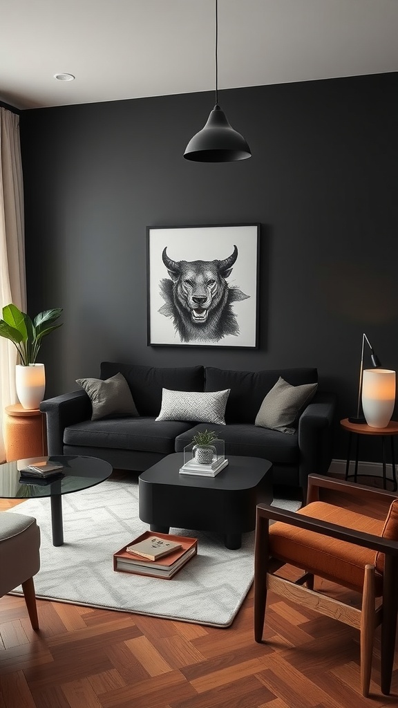 A black couch can easily become the star of your living room. Its bold color provides a striking contrast against lighter walls or decor. In this setup, the couch is paired with a dark wall and warm wooden floors, creating a cozy yet modern vibe.