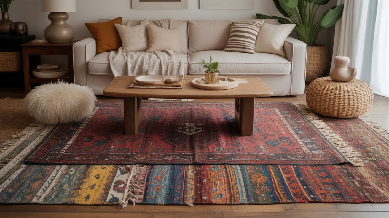One rug is never enough in a boho living room. Layer different rugs with various patterns, colors, and textures to add depth and warmth.