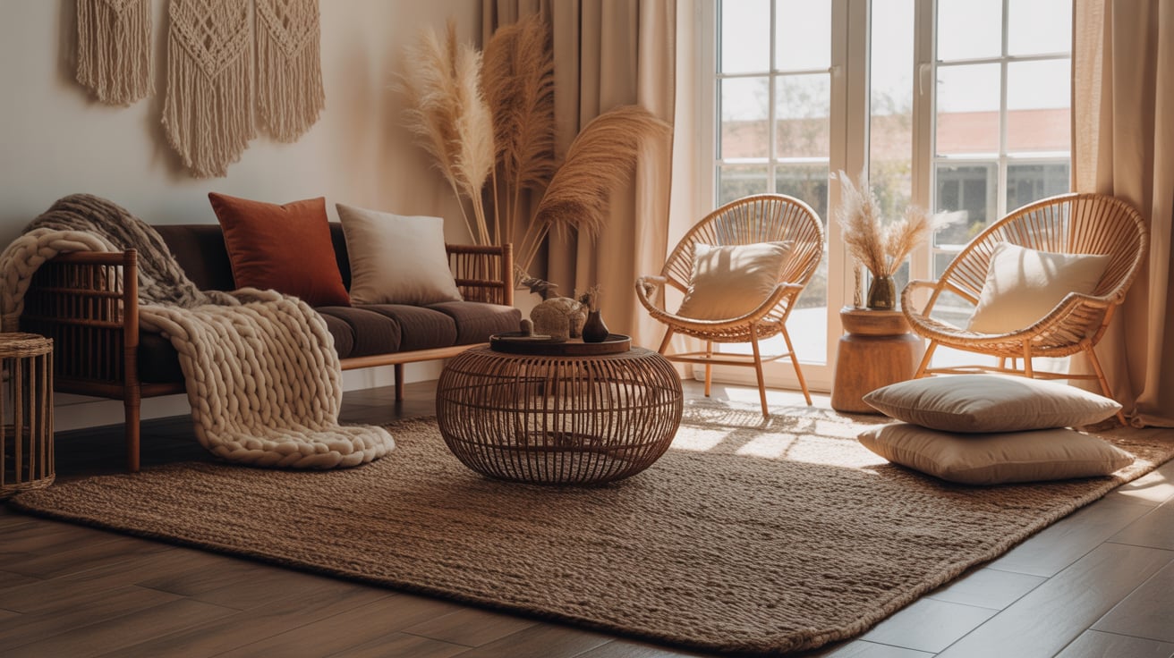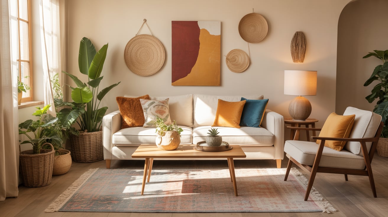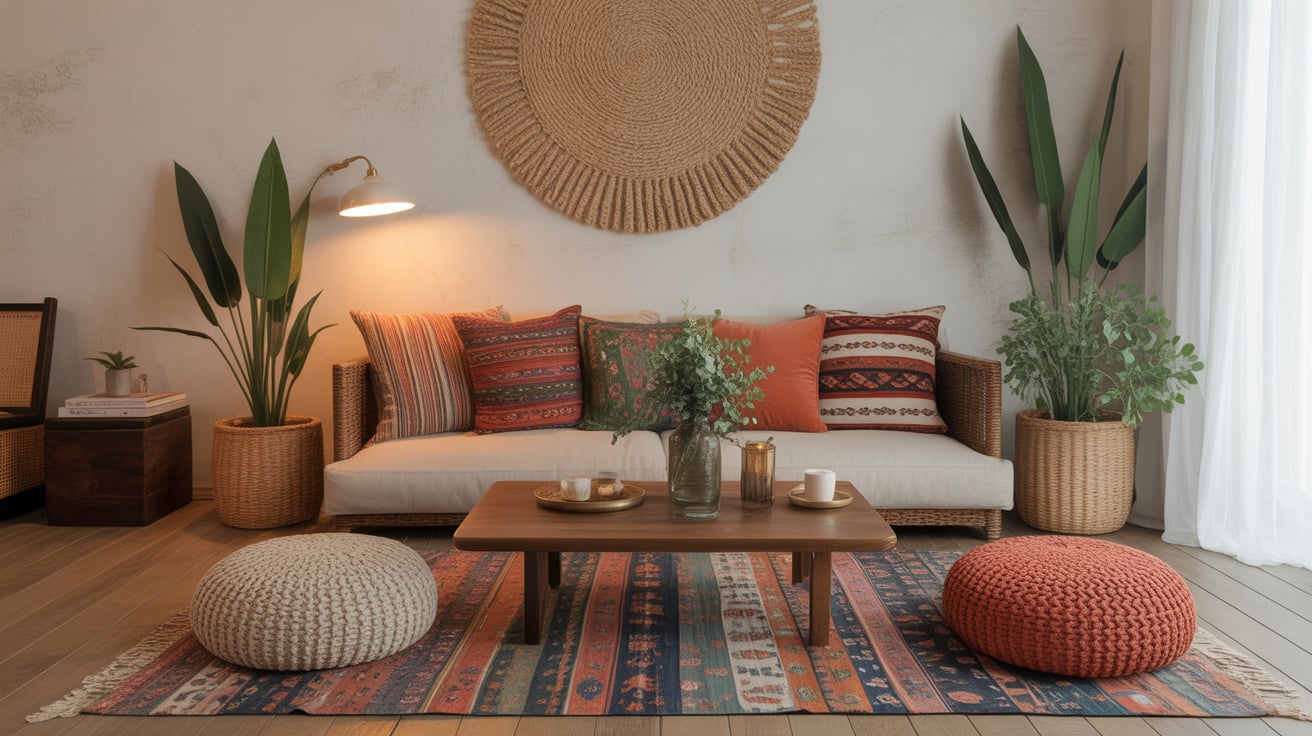 Texture is a key element in boho design. Mix soft fabrics, woven baskets, wooden furniture, and rugs to make your living room feel inviting. Textures give the room a tactile richness that makes it comfortable and stylish.