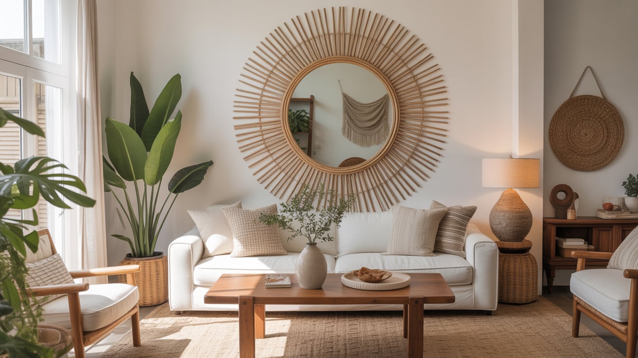 Choose mirrors with unique frames, like woven, wooden, or metal designs, to complement the boho vibe. They reflect light and enhance the warmth and depth of your living room.