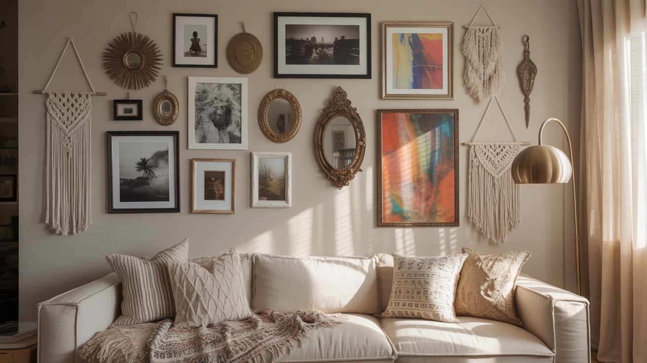 A gallery wall adds visual interest and personality. Mix prints, photos, mirrors, and macrame art for an eclectic look.