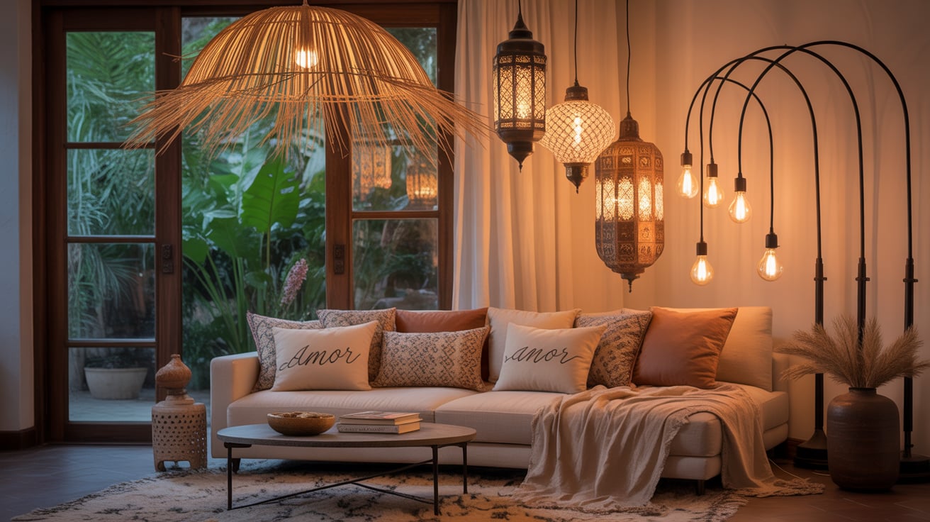 Soft, warm lighting keeps the room cozy, while unique fixtures become conversation starters. Combining different types of lighting adds dimension and a whimsical touch to your boho space.