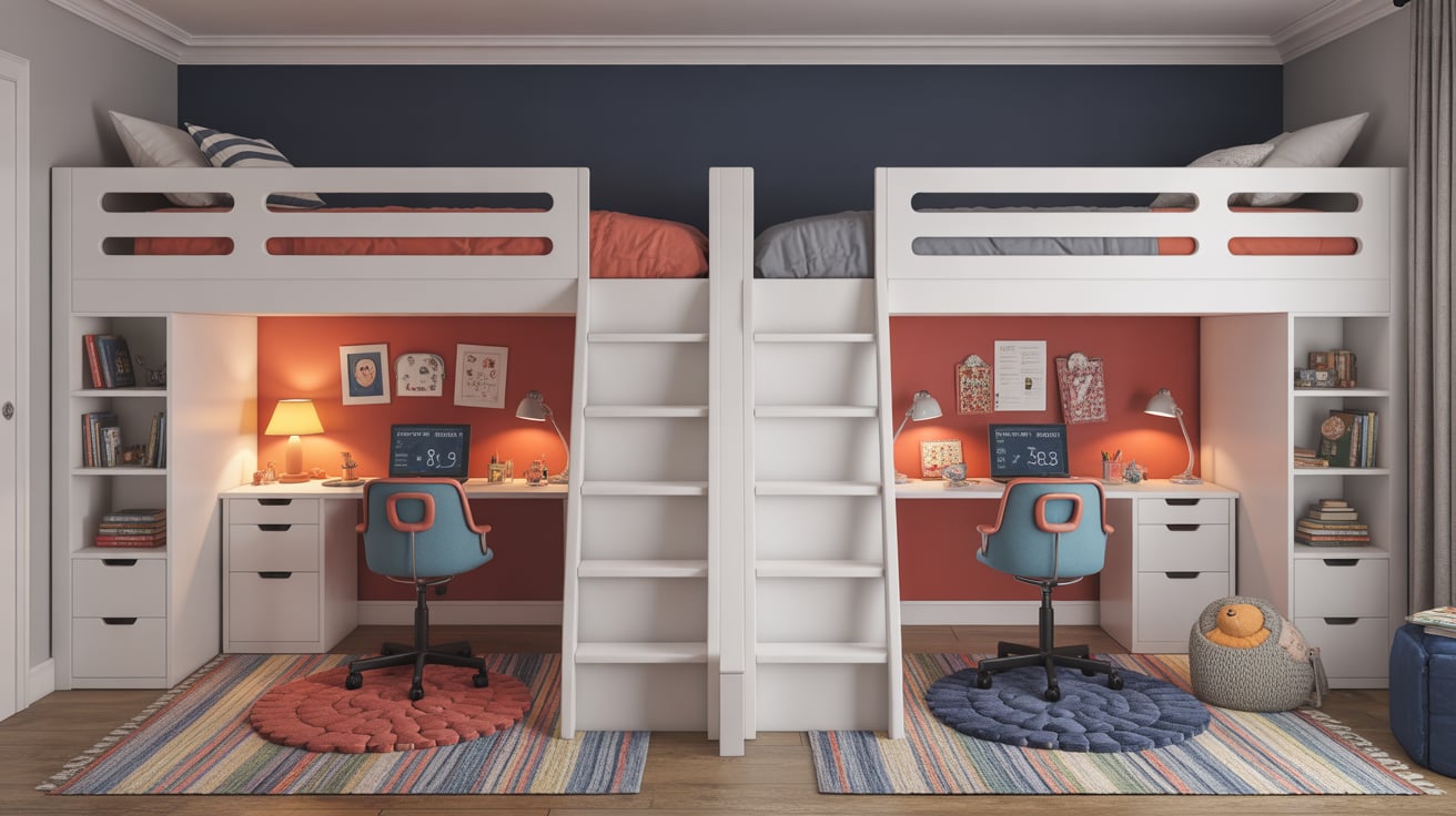 Adding playful rugs or cushions underneath the loft bed can also create a cozy reading nook or a fun play area, making the shared space enjoyable for both kids.