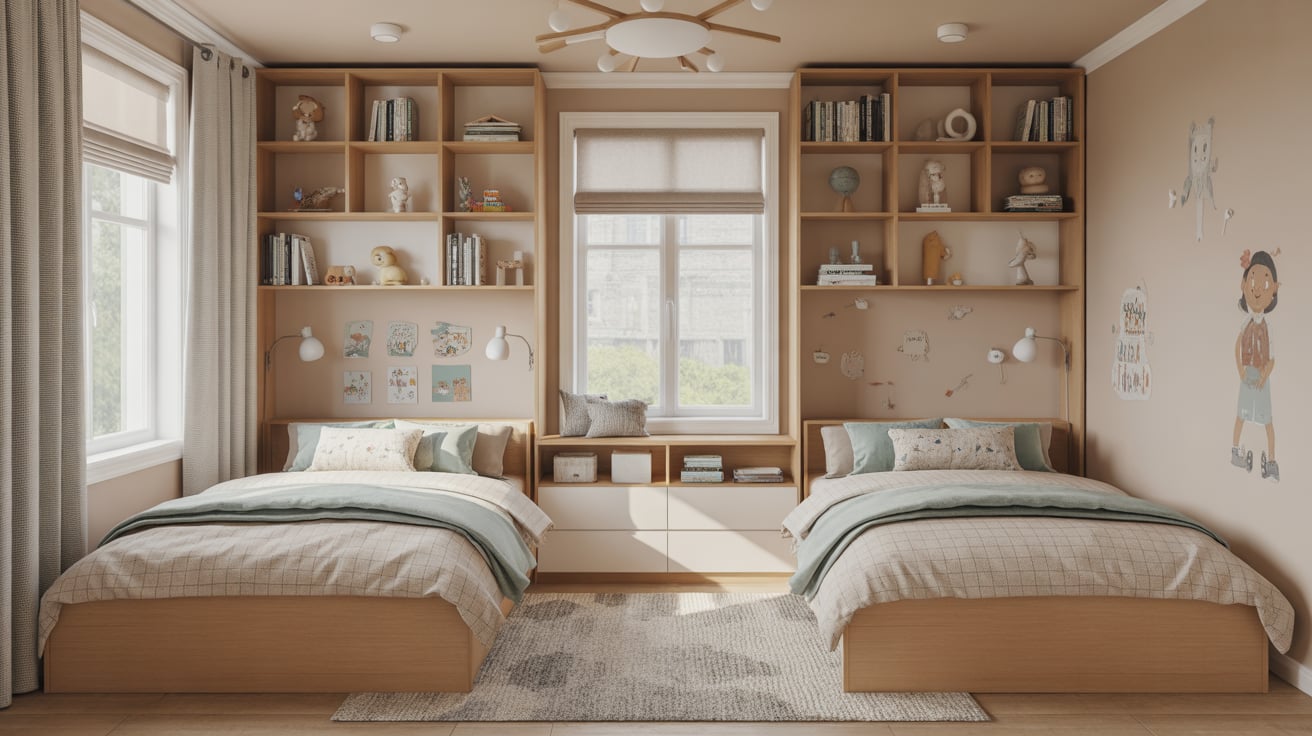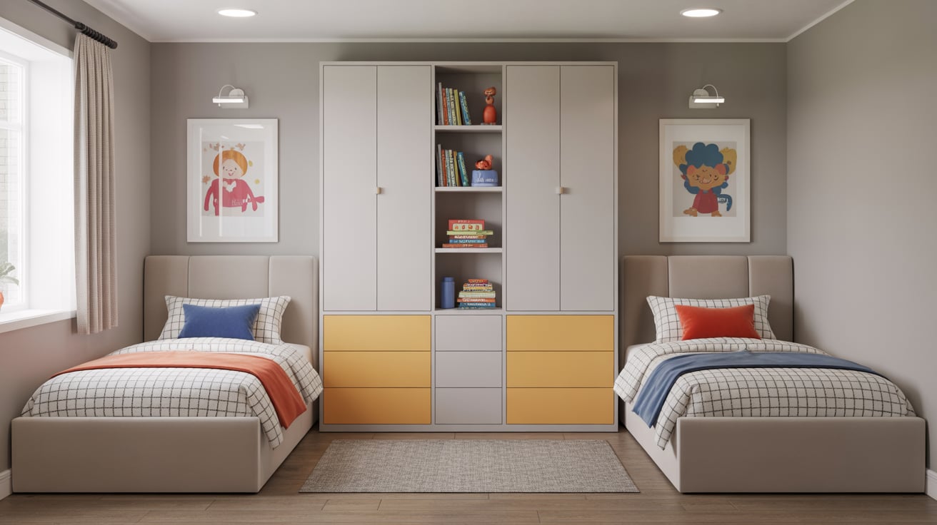 Placing twin beds on opposite sides of the room with a shared storage unit in the center is a practical layout. It keeps each child’s sleeping area separate while providing a functional common space.