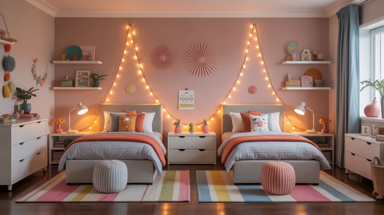 Lighting can transform a shared bedroom into a magical space. Use string lights, desk lamps, or wall-mounted lights to create cozy zones for each child.