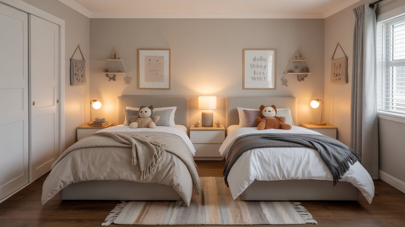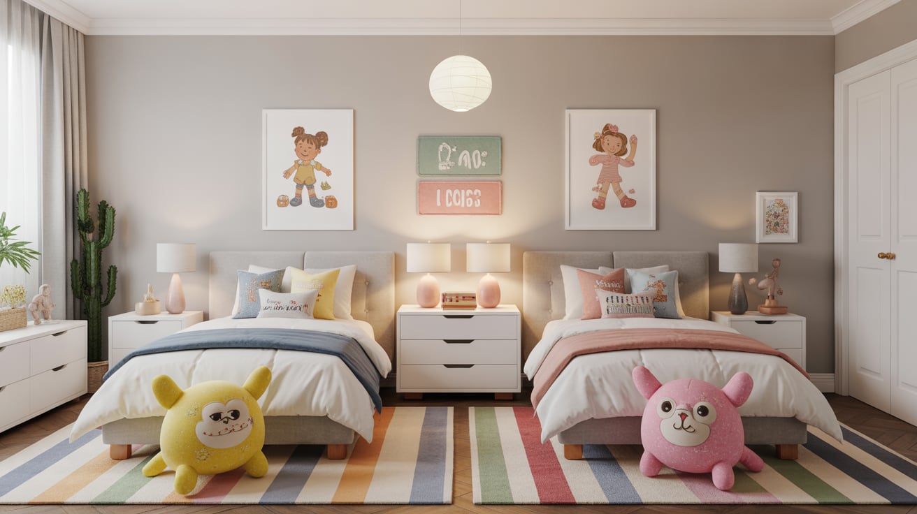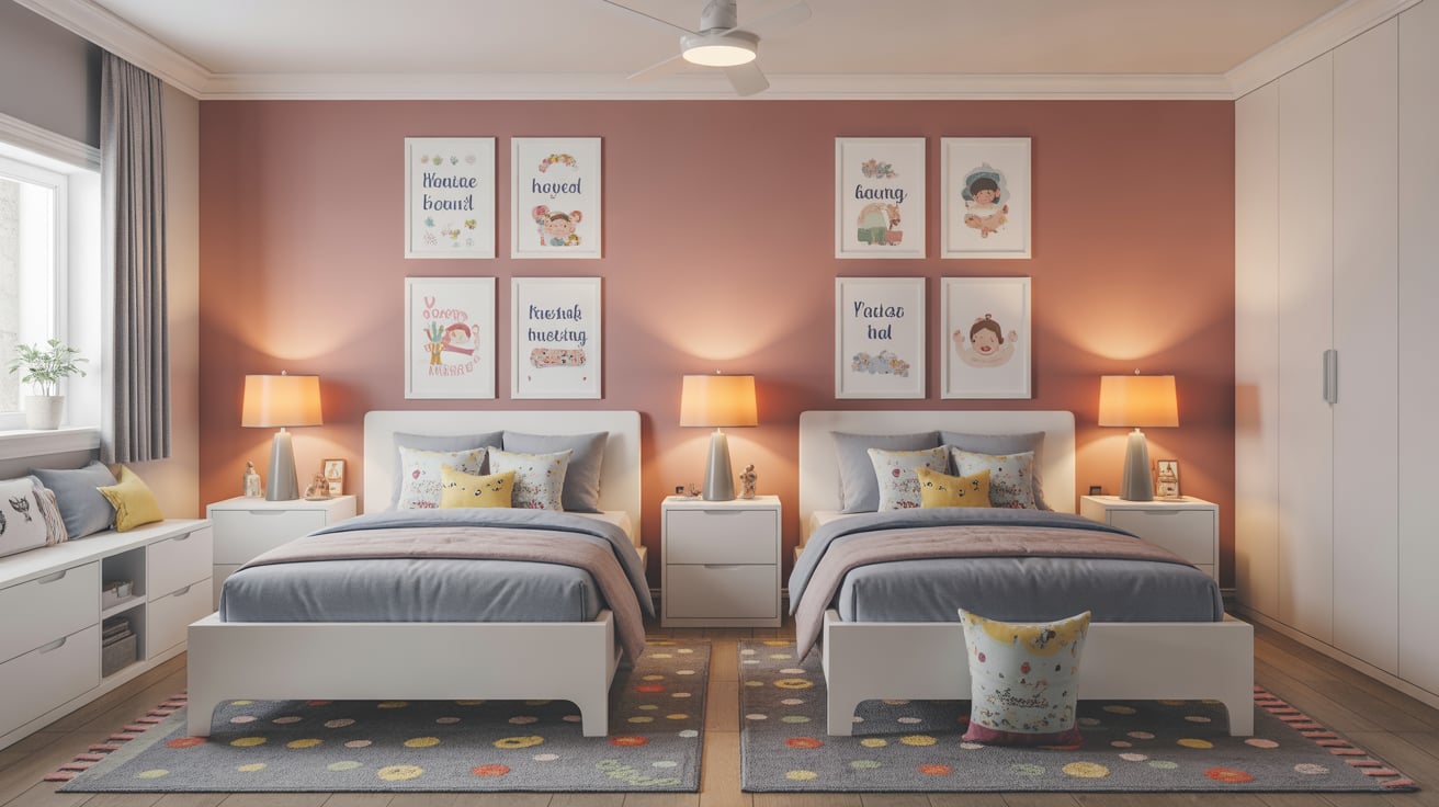 This helps balance the room’s aesthetic while giving each child a sense of ownership. Simple design changes, like alternating frames or color patterns, make the space visually appealing.