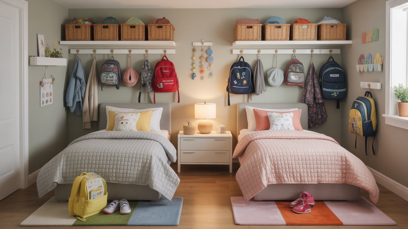 Hanging storage solutions like wall pockets, hooks, or baskets free up floor space while giving each child their own storage area.