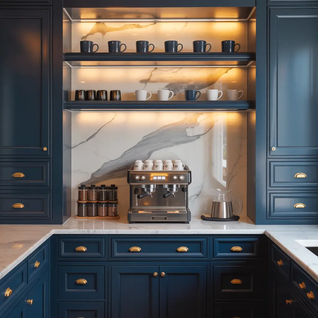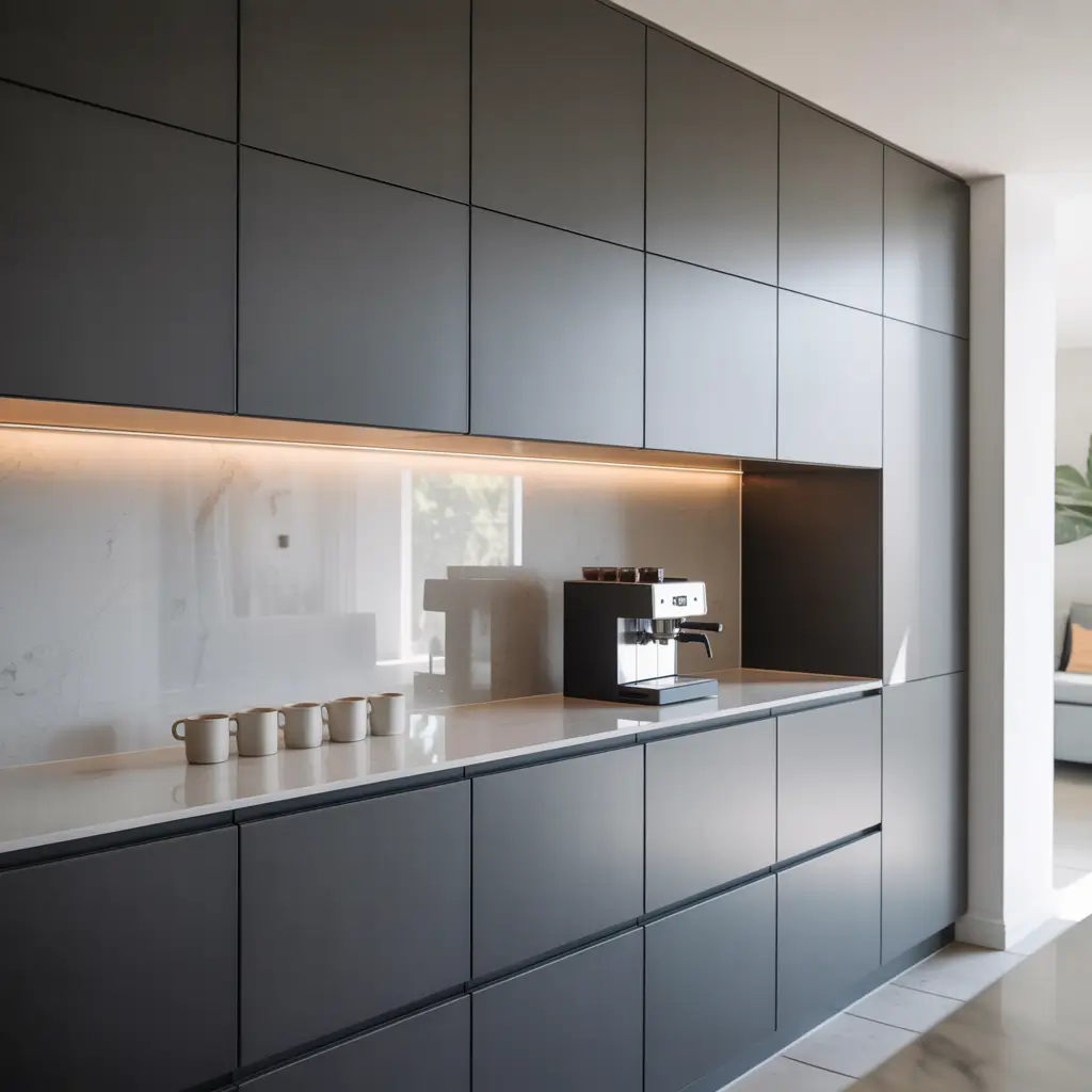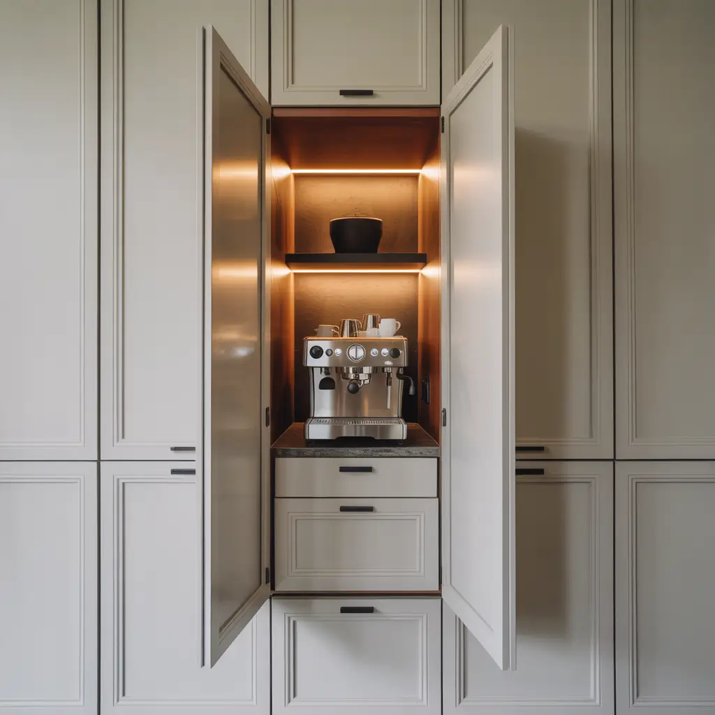 Your coffee machine becomes the star of the show here. Invest in one sleek, high-quality machine rather than cluttering the space with multiple gadgets. Store it on a pull-out shelf so you can tuck it away when not in use, leaving nothing but clean lines visible.