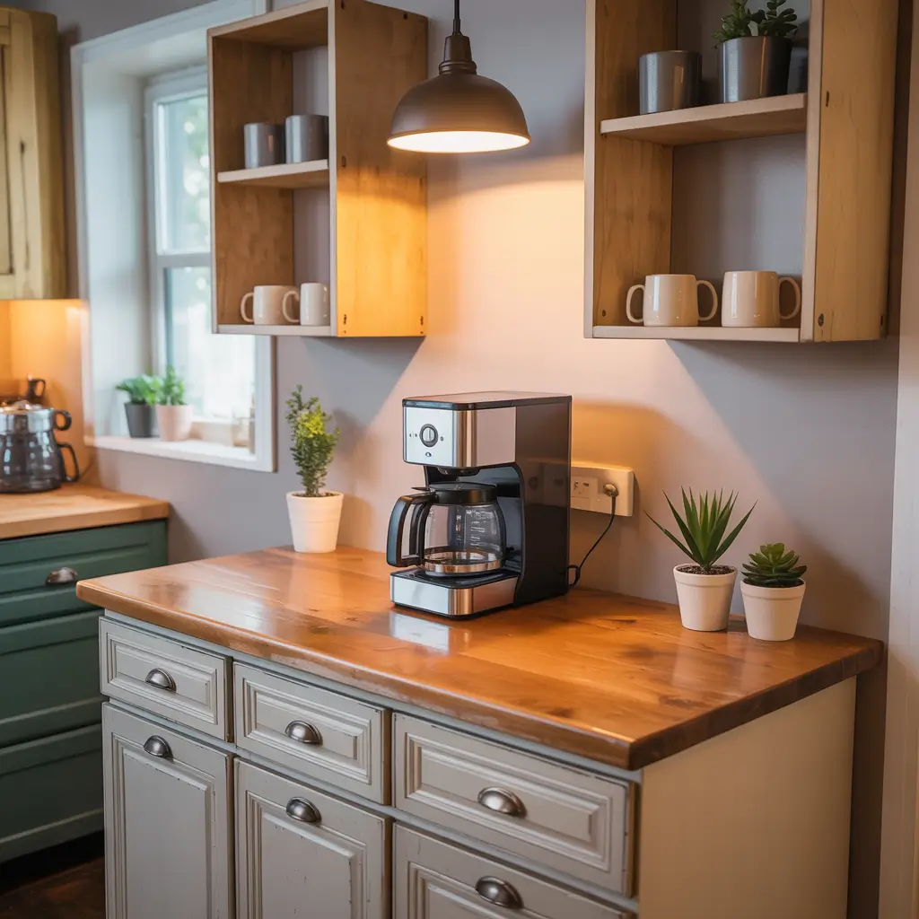 Mount a small floating shelf or cabinet at chest height. This becomes your coffee prep zone. Below it, add a deeper cabinet base that can hold your coffee maker when you’re using it and tuck away when you’re not. Above? Install open shelving or a shallow cabinet for easy access to your daily essentials.