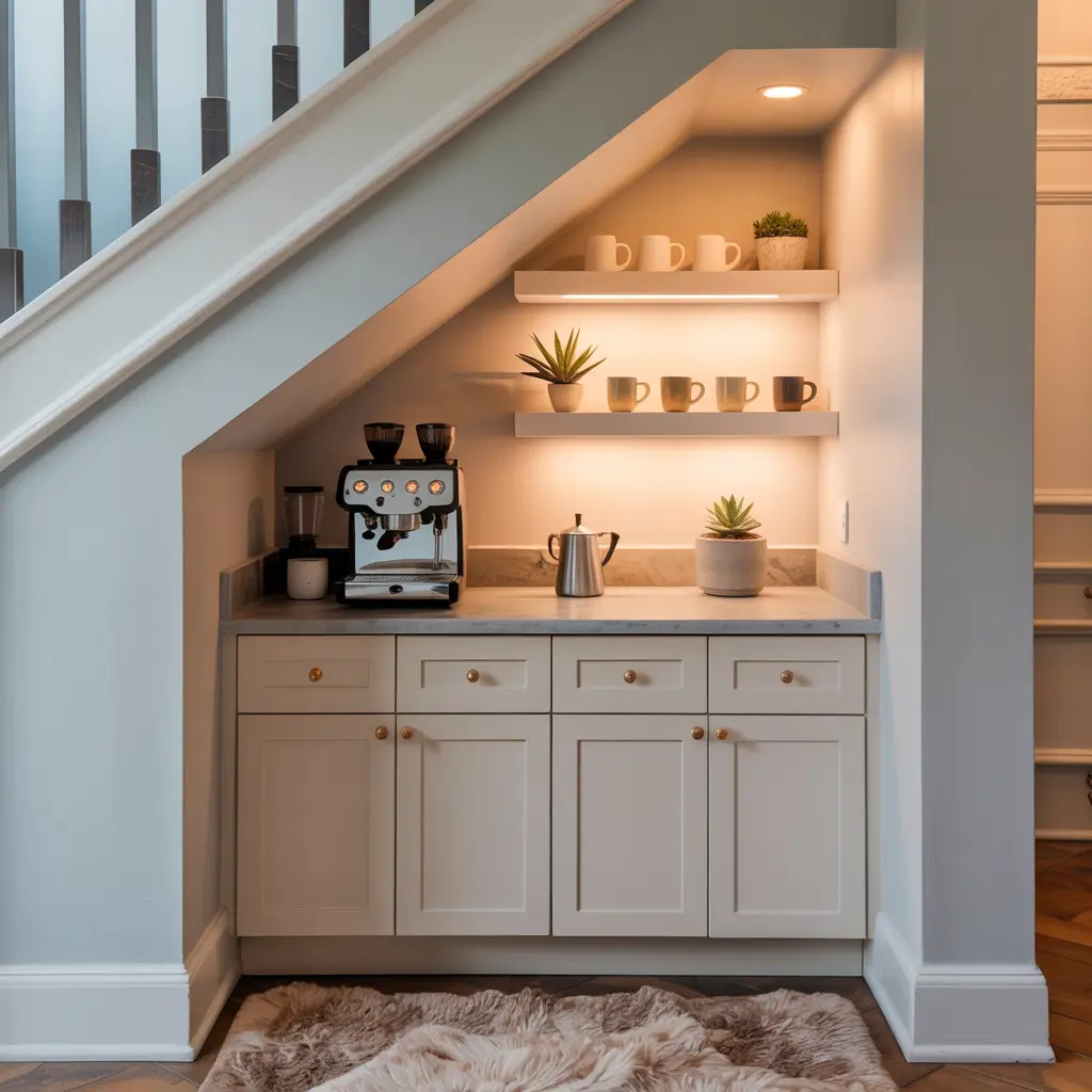 I helped a friend convert her under-stair closet into a coffee bar last summer. We removed the door, built a counter at standard height along the back wall, and installed open shelving that followed the slope of the stairs above. The angled shelving actually added character instead of looking awkward.