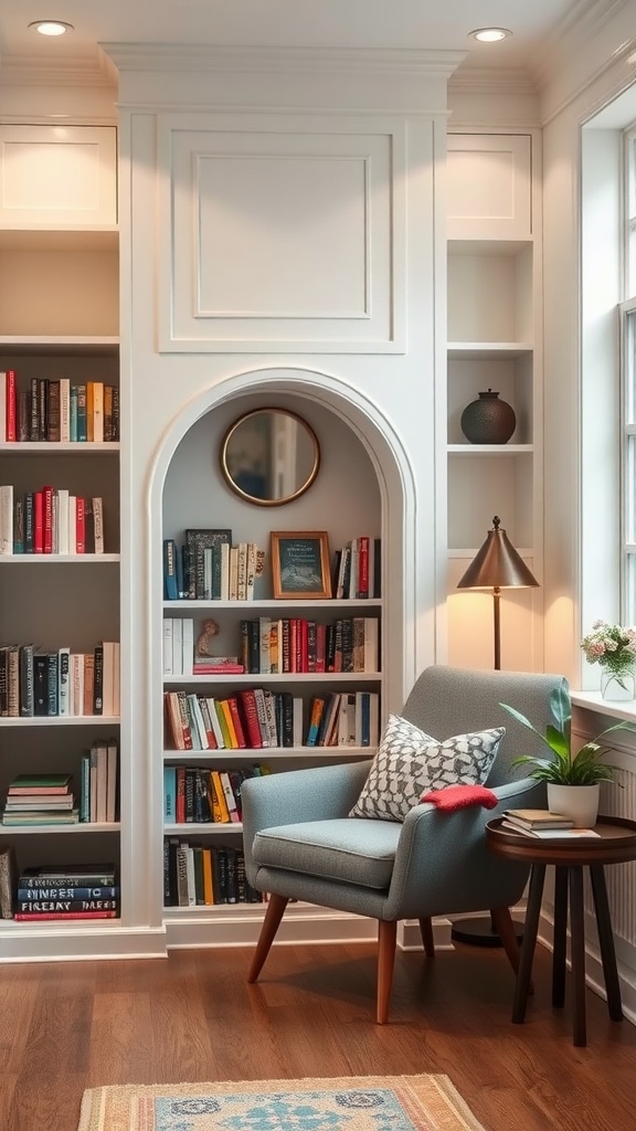 Creating a cozy reading nook is all about comfort and style. The image shows a charming corner with built-in shelves that make great use of space. The shelves are filled with books, providing an inviting backdrop for any reader.