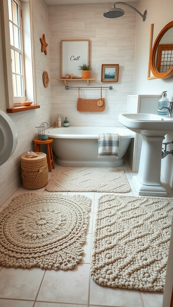 Textured rugs can make a big difference in a coastal bathroom. The image shows lovely rugs that add warmth and style. Soft, woven designs invite you to kick off your shoes and enjoy the space. They bring a cozy feel, perfect for stepping out of the bath.