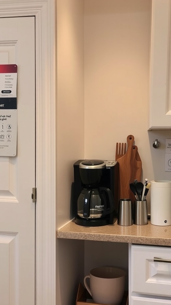 This image captures a cozy corner dedicated to coffee, perfect for those who love their morning brew. The compact setup includes a coffee maker, making it easy to whip up a fresh cup whenever needed.
