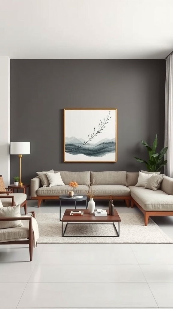 The sectional sofa, with its light fabric and minimalist design, invites relaxation. It’s perfect for gatherings or cozy evenings at home. The light colors contrast beautifully with the dark wall, creating a balanced look.