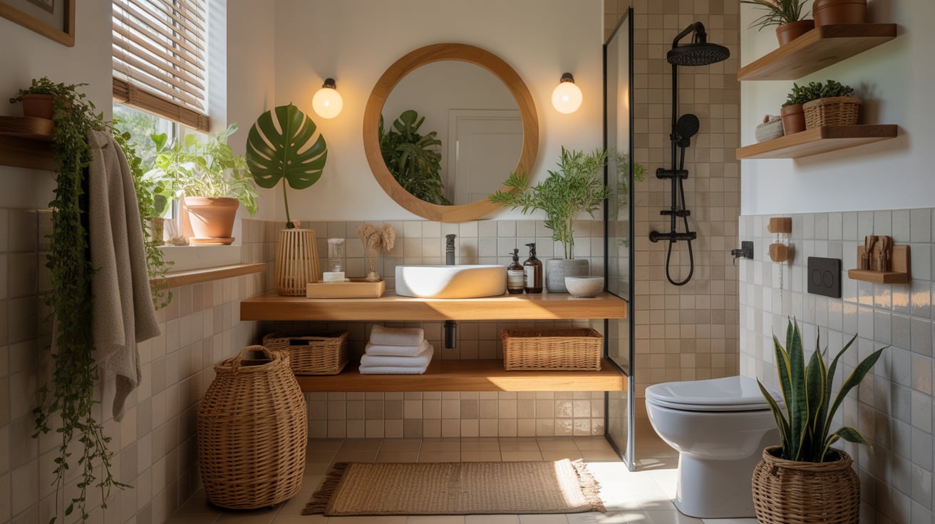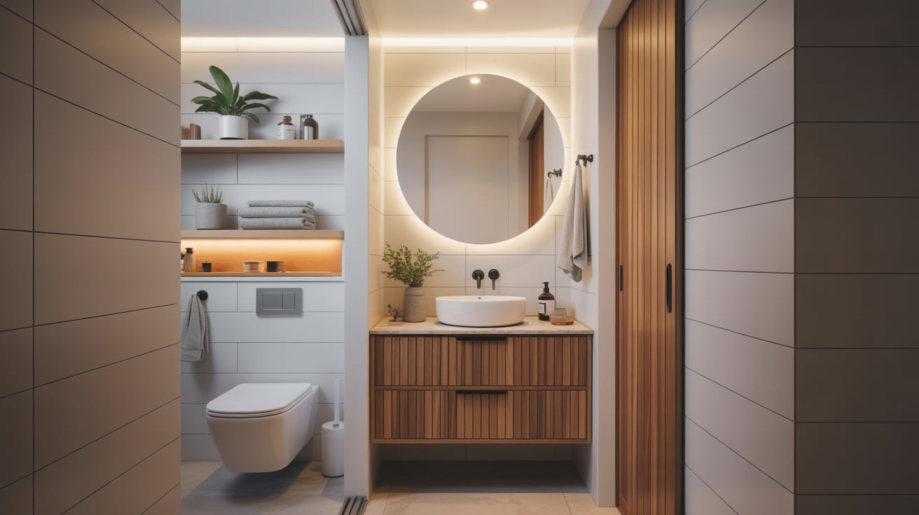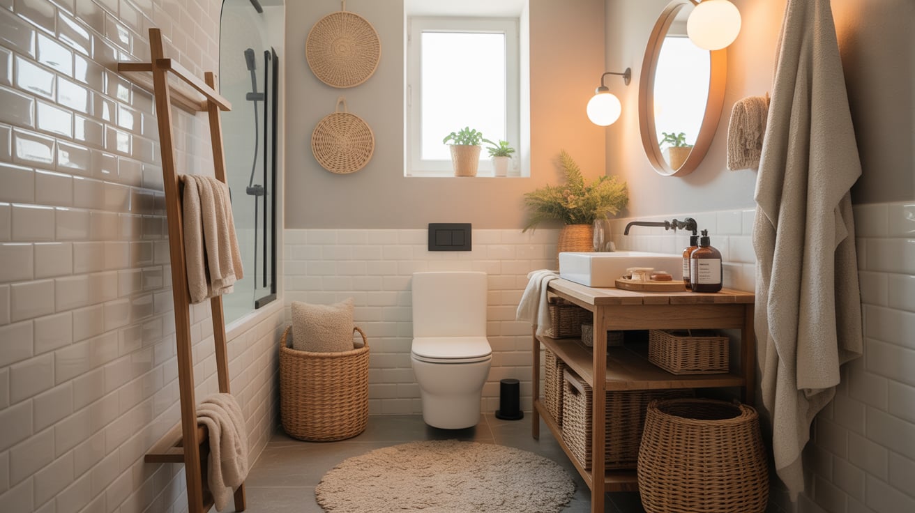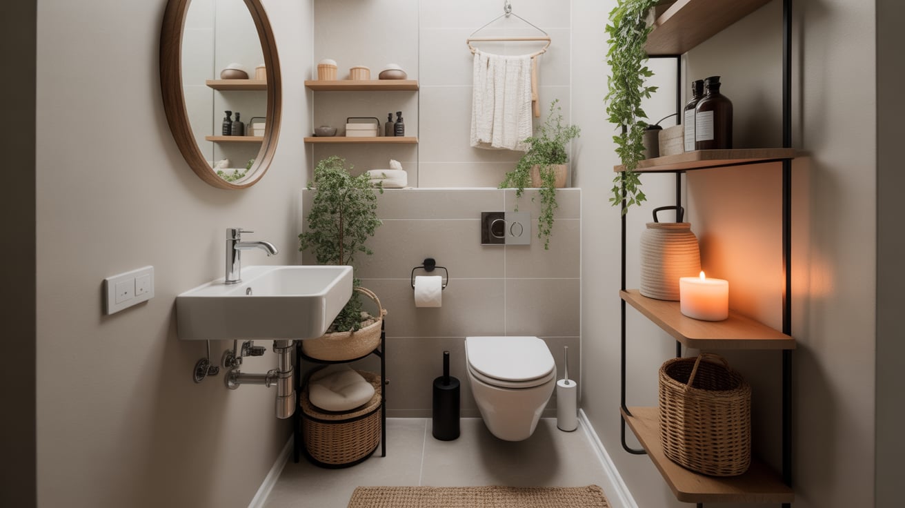 Adding plants or natural materials like wood and stone instantly warms up a small bathroom. Small potted plants, bamboo shelves, or wooden trays create a cozy and fresh vibe.