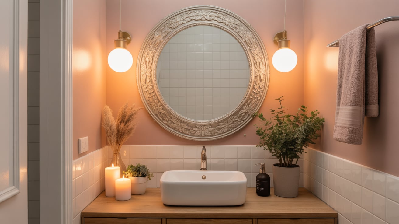 Try mirrors with decorative frames or round shapes to add a cozy touch. Position it opposite a window or light source to reflect natural light and make your bathroom feel more welcoming.