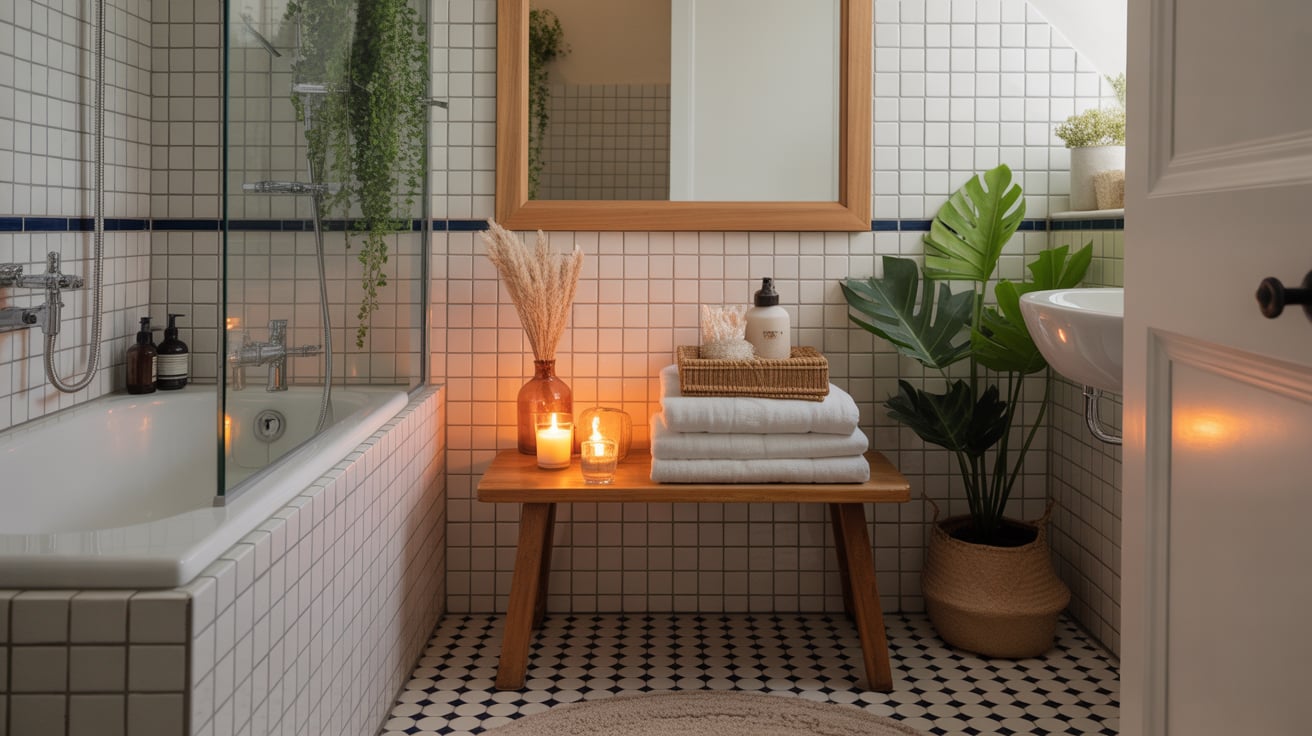 Choose a wooden or cushioned stool for a warm touch. Even a tiny seating option makes your bathroom feel more comfortable and thoughtfully designed.