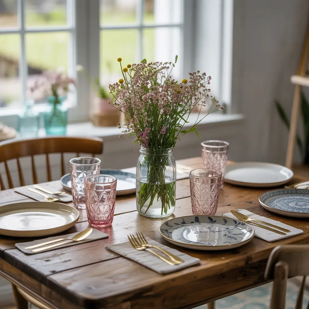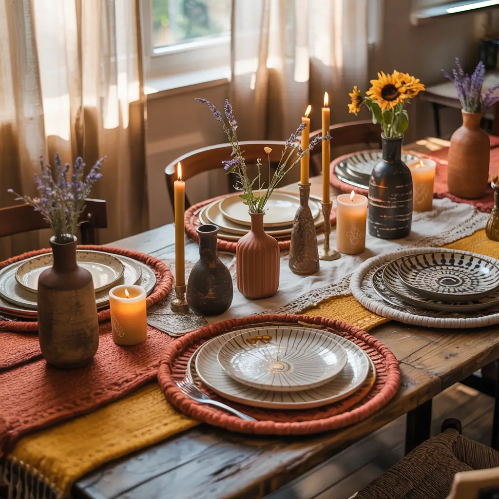 Layer your textiles! Start with a macramé or woven table runner, add colorful patterned napkins (don’t worry about matching perfectly), and mix in different plate styles. Mismatched vintage china actually enhances the boho vibe.