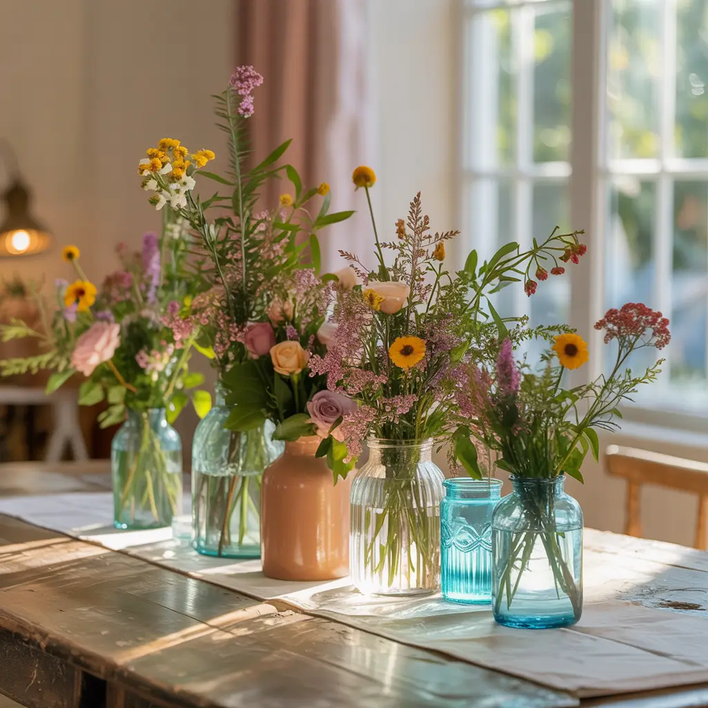 For containers, think beyond traditional vases. I use vintage bottles, mason jars, teacups, or even hollowed-out fruits like pineapples or pumpkins for seasonal tables. Line them up down the center of your table for a garden-inspired runner effect.