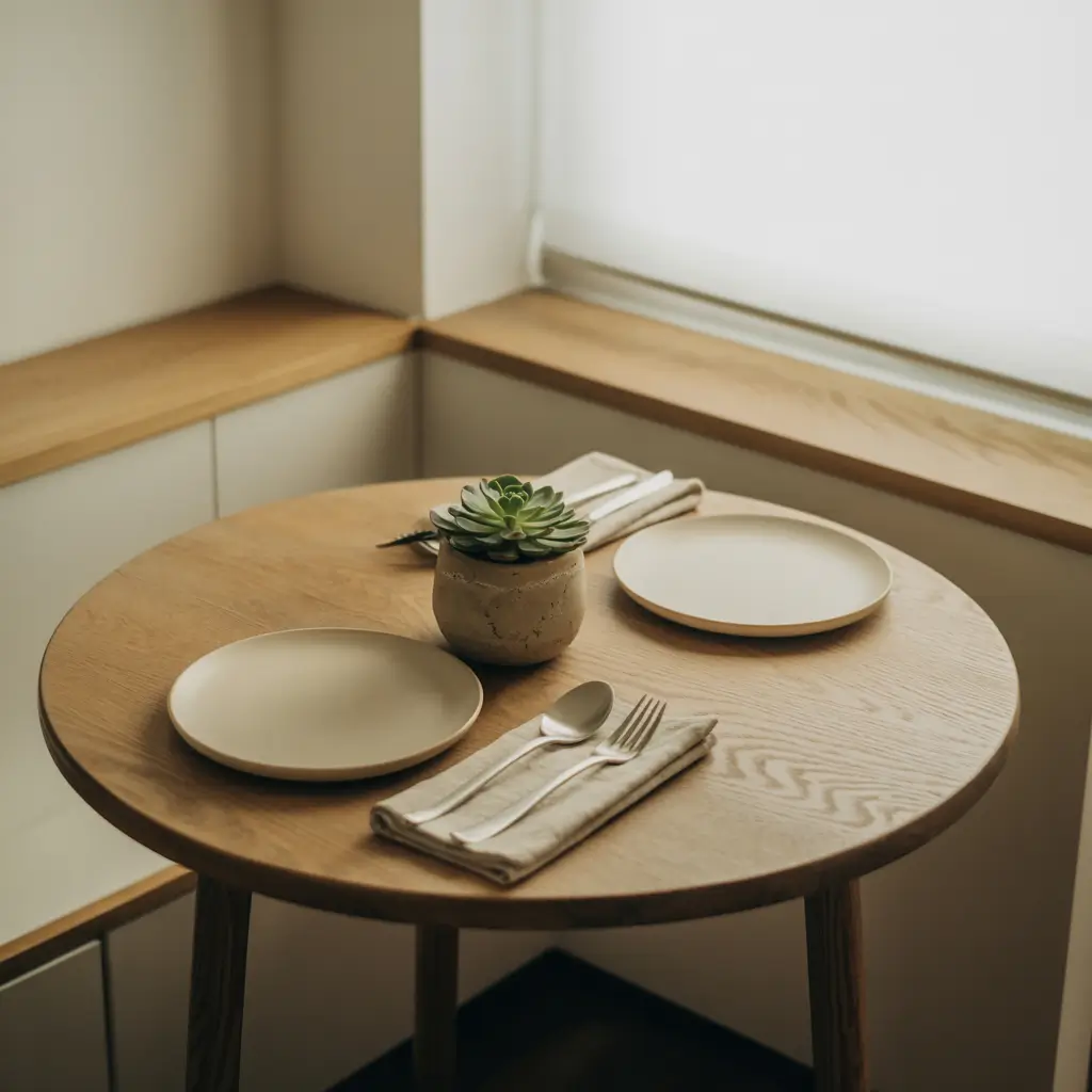 Scale down everything. Instead of a long table runner, use placemats or a small centerpiece. Choose one compact focal point rather than multiple decorative elements. A single small vase with flowers, a cluster of three votives, or a small potted plant works perfectly.