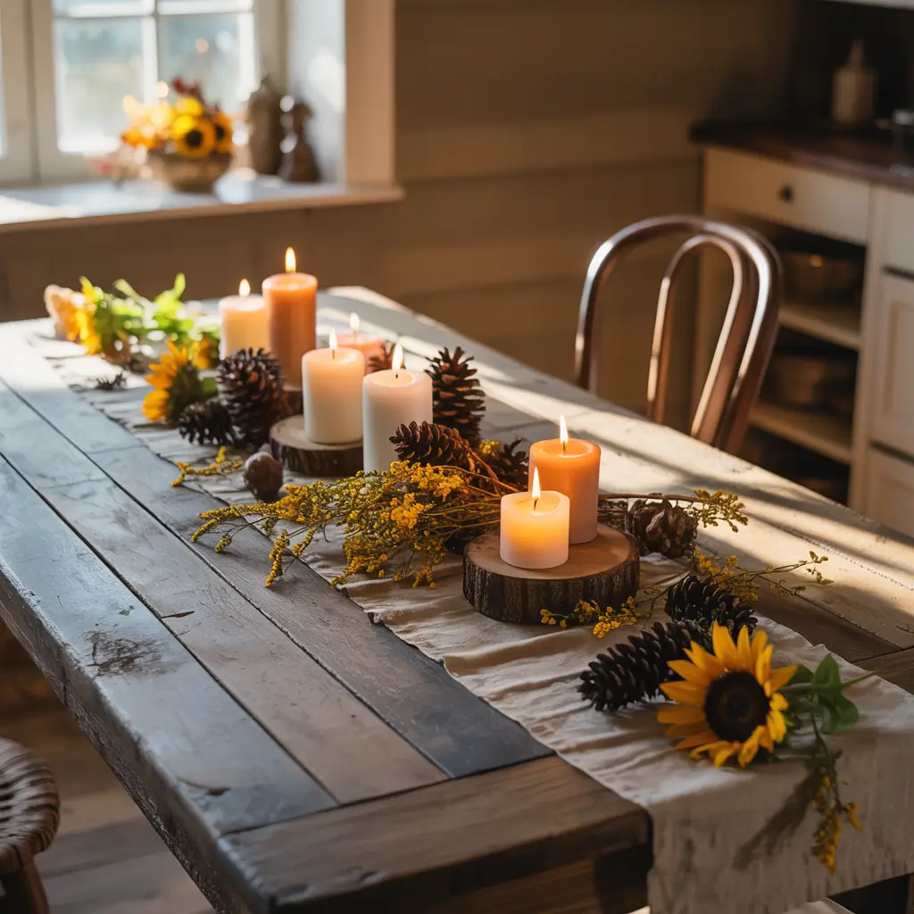 For centerpieces, I’m obsessed with using wooden dough bowls filled with a mix of real and faux elements—think small gourds, acorns, and seasonal flowers like mums or dahlias. Candles are non-negotiable for fall tables. Use varying heights of pillar candles in amber or cream shades.
