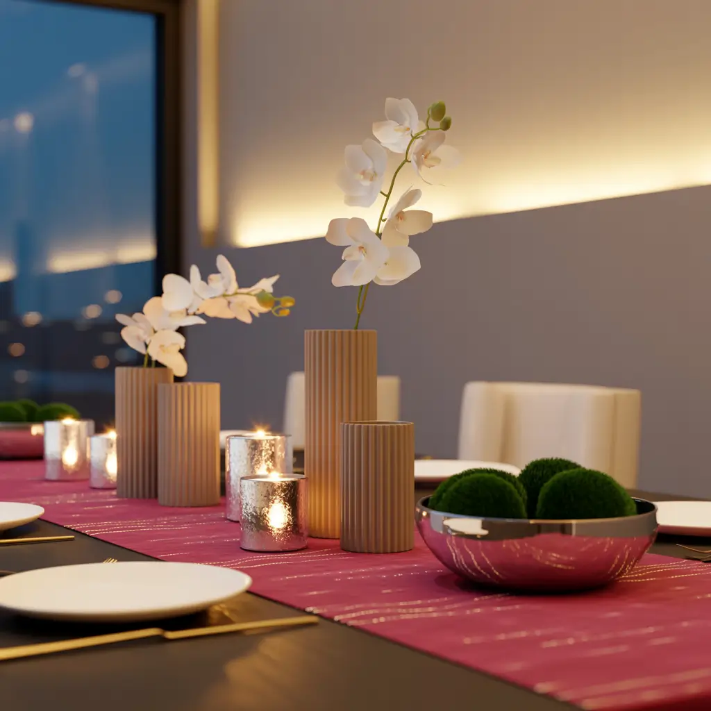 Beyond runners, statement accents like an oversized bowl, a unique sculpture, dramatic candlesticks, or an unexpected object (vintage books, a beautiful wooden box, a collection of interesting bottles) make your table memorable.