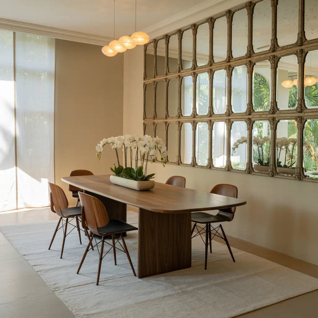 Mirrors are basically magic for dining rooms. They bounce light around, make small spaces feel bigger, and add instant elegance. Strategic mirror placement can literally double the perceived size of your dining area.