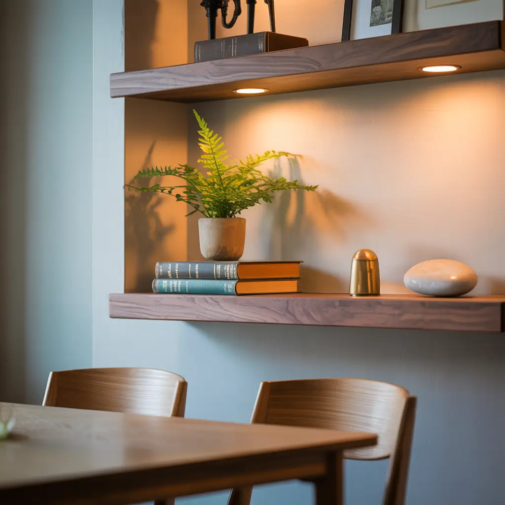 Floating shelves give you flexibility that permanent fixtures just can’t match. You can switch up the styling whenever you get bored (which, if you’re like me, happens seasonally). These shelves transform your wall into a functional art display.