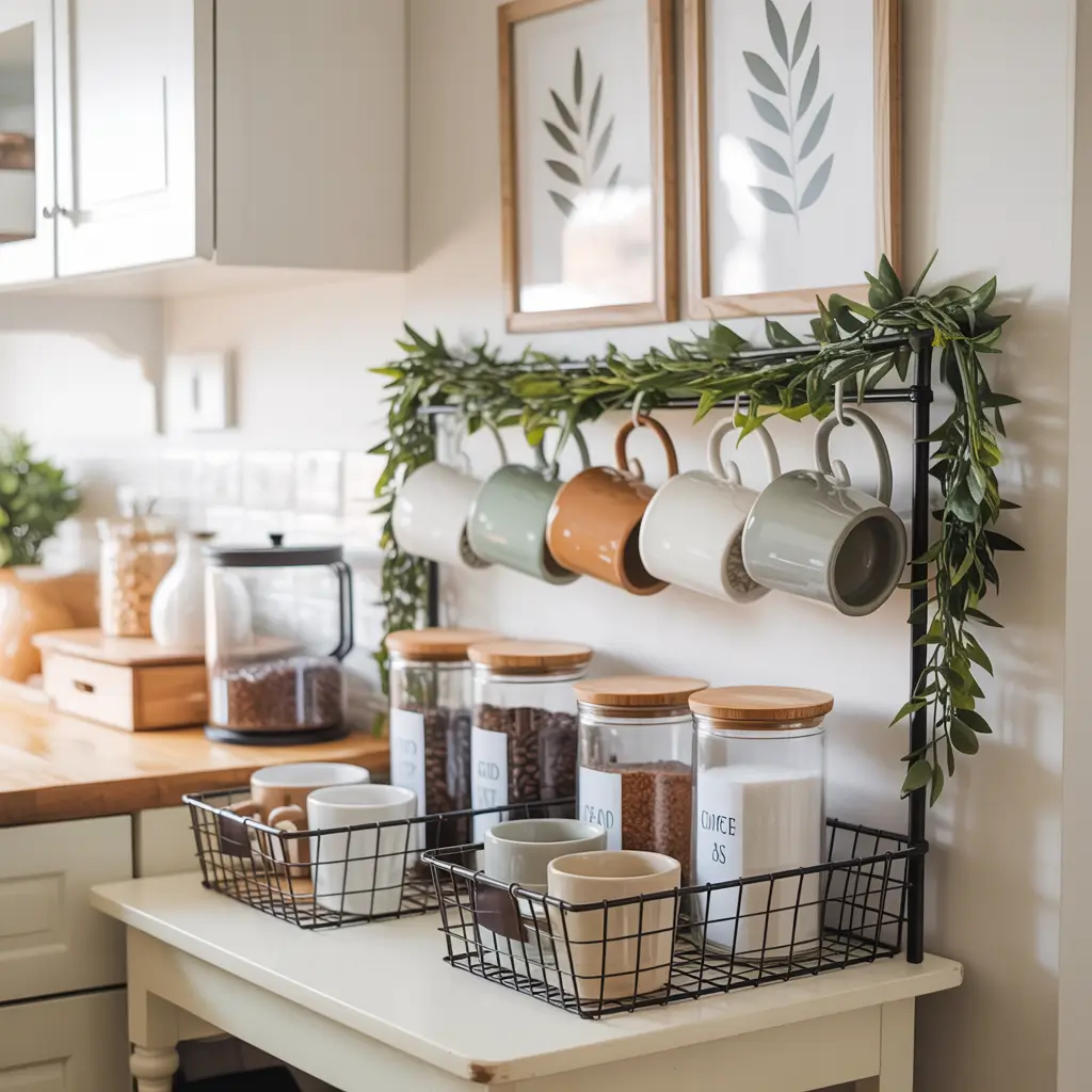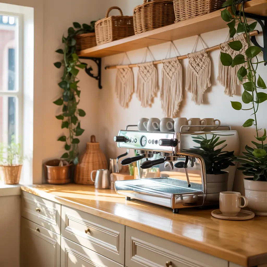 Layer in some macramé—maybe a small wall hanging above your coffee bar or a macramé plant hanger beside it. Use mugs in earthy tones like terracotta, cream, and sage green. Add a small vintage rug or fabric runner under your coffee setup to define the space.