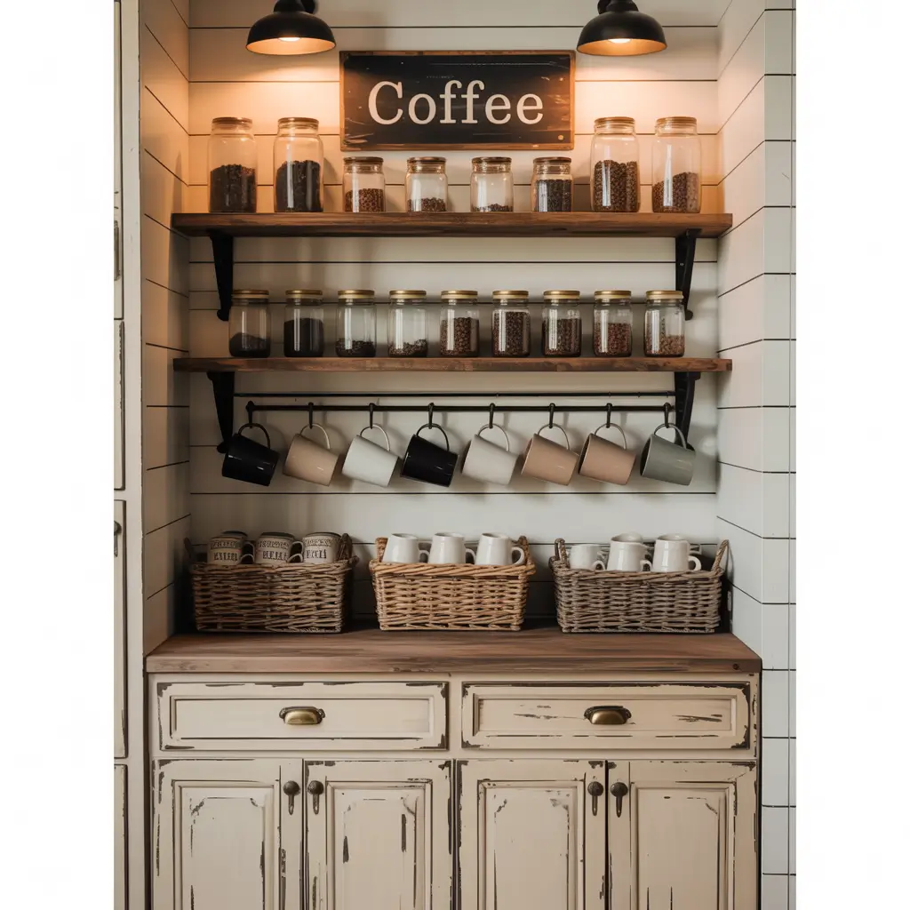 Creating a farmhouse coffee bar in a small space means focusing on key elements: wood tones, white or neutral colors, and vintage-inspired accessories. I snagged an old wooden crate from a garage sale for $5, painted it white, distressed it slightly with sandpaper, and mounted it on my wall as a shelf.