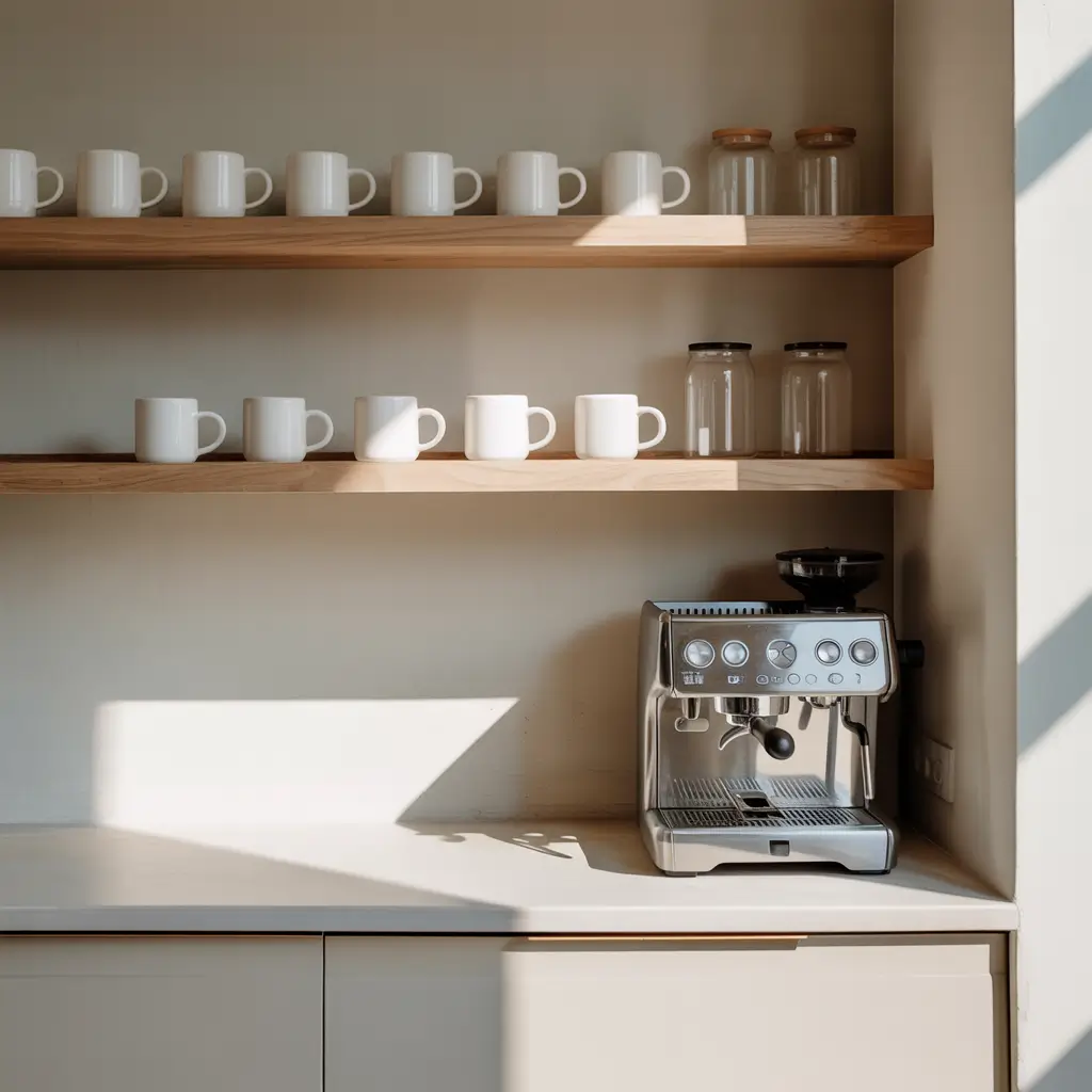 Keep only what you actually use daily on display. Everything else goes in a cabinet. Choose items in a cohesive color scheme—I went with all white and natural wood. Your coffee maker becomes a design element, so pick one that looks good.