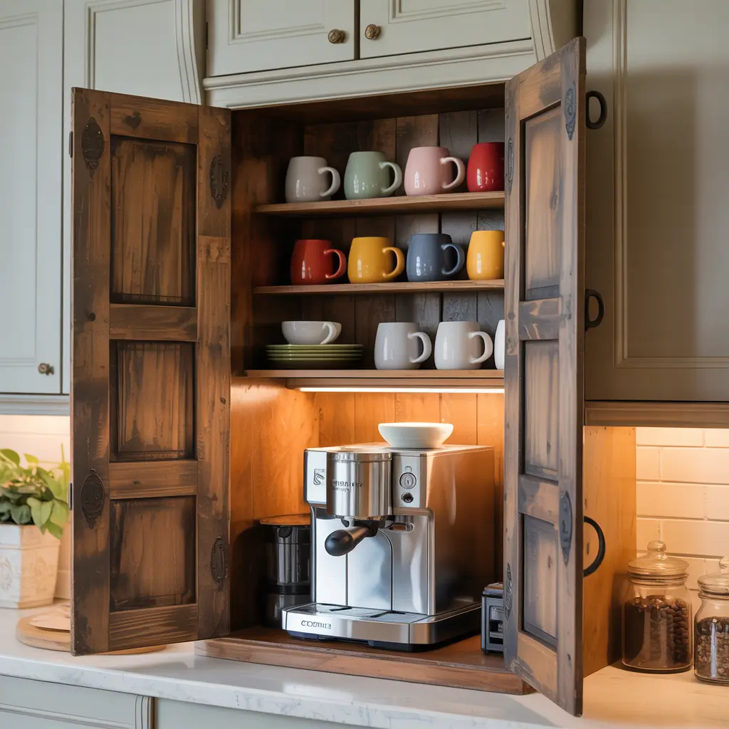 Measure the interior of your cabinet before committing to this idea. Your coffee maker needs to fit comfortably with the door closed (or at least able to close when not in use). Add a small power strip inside if you don’t have an outlet nearby—though keep fire safety in mind.
