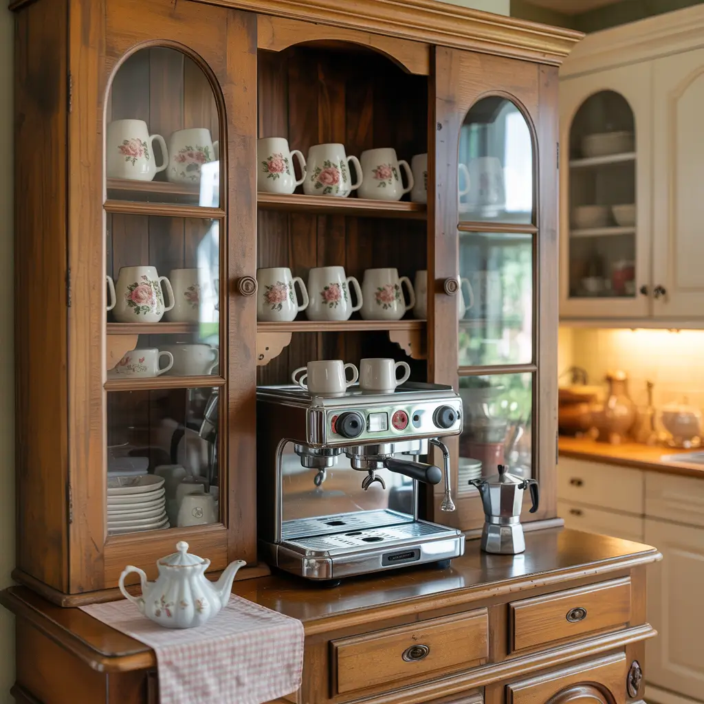 Keep the original hardware if it’s in good shape—vintage knobs and pulls add to the charm. If it’s damaged, replace it with vintage-inspired hardware from the hardware store. Position your coffee maker on the main surface and use the shelves above for mugs and decorative items.